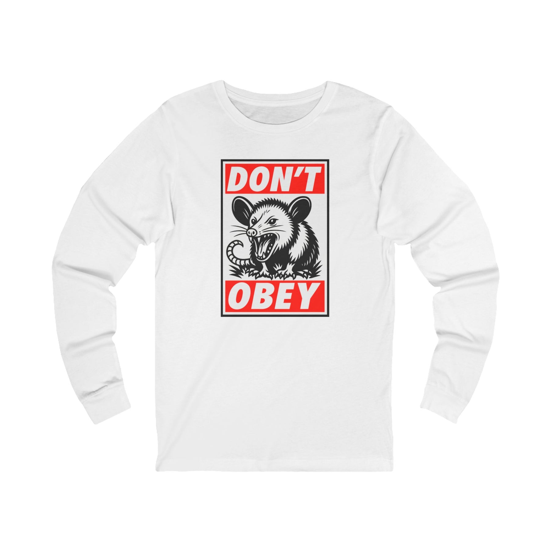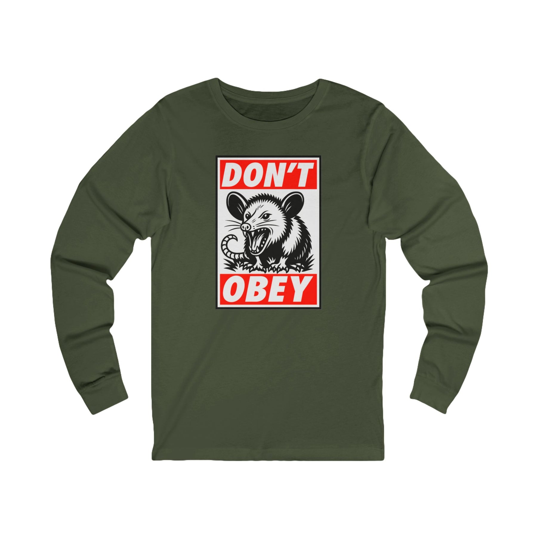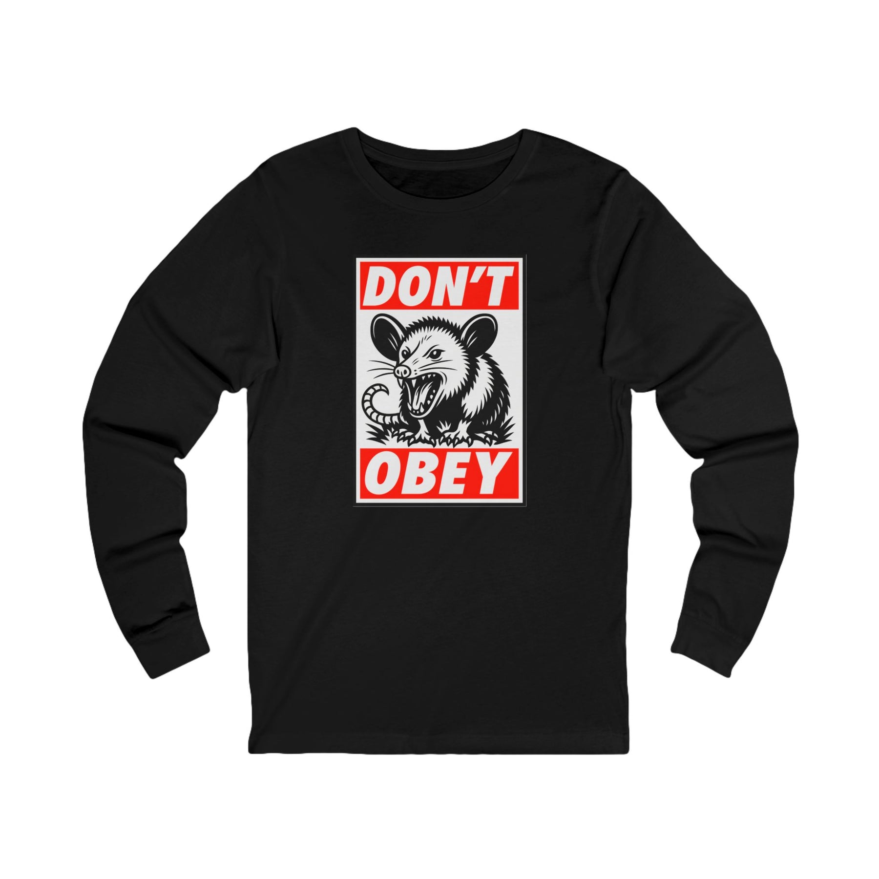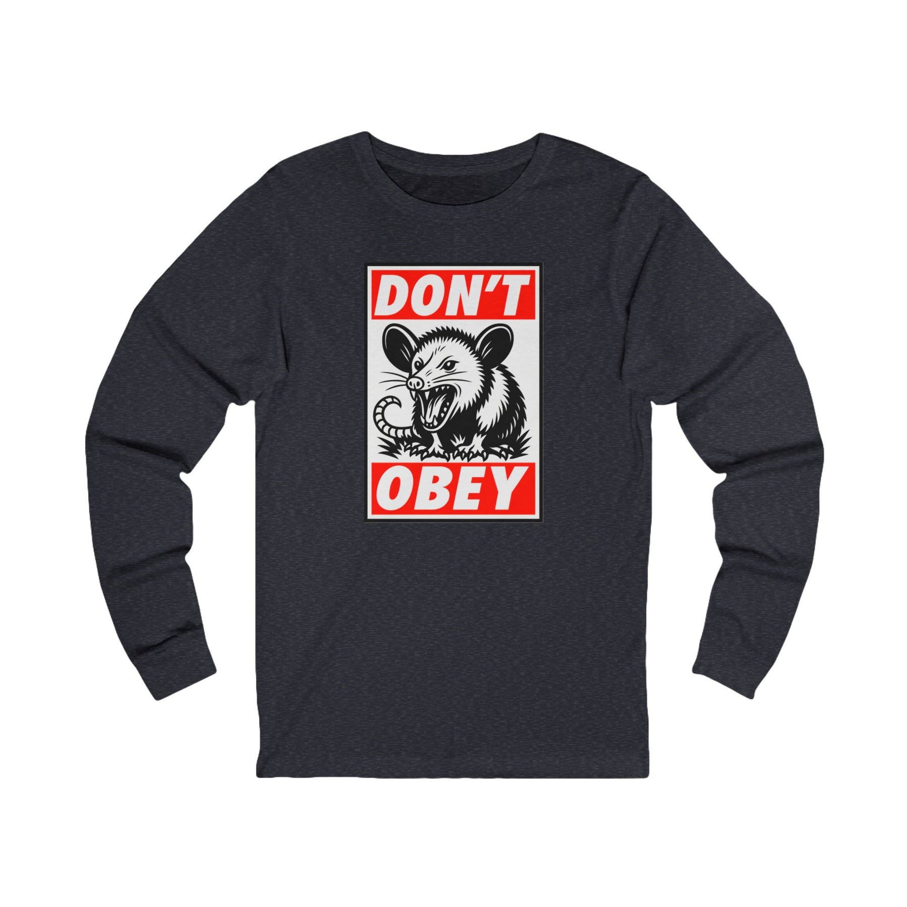 Don't Obey. Street art meets scrappy defiance in this Shepard Fairey-inspired design featuring nature's most anti-authoritarian survivor. The bold red and black propaganda poster aesthetic delivers the message that obedience to tyranny isn't required—just ask any opossum. This classic Bella+Canvas long sleeve fits like a well-loved favorite, perfect for cooler weather organizing, evening rallies, and every moment when compliance needs questioning.