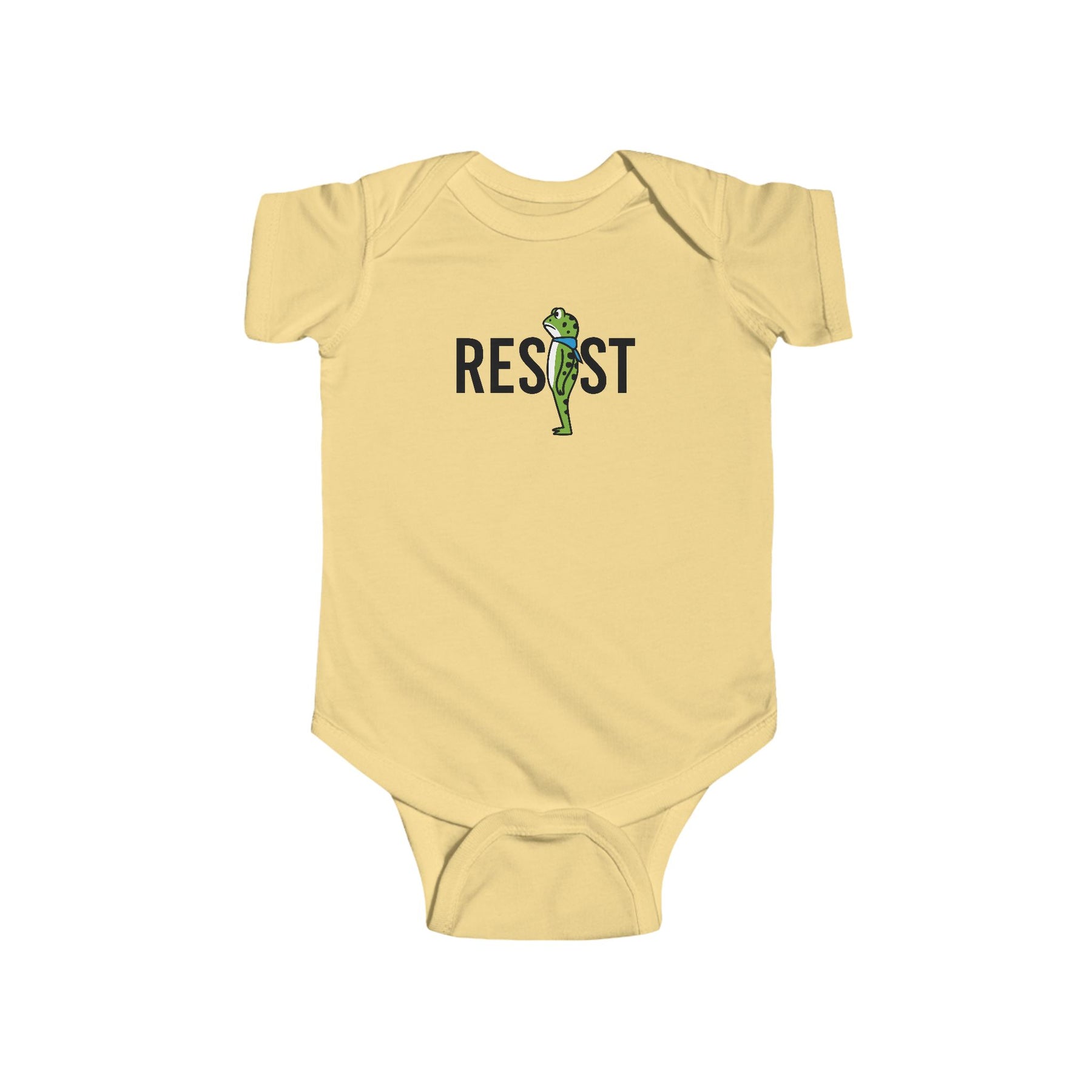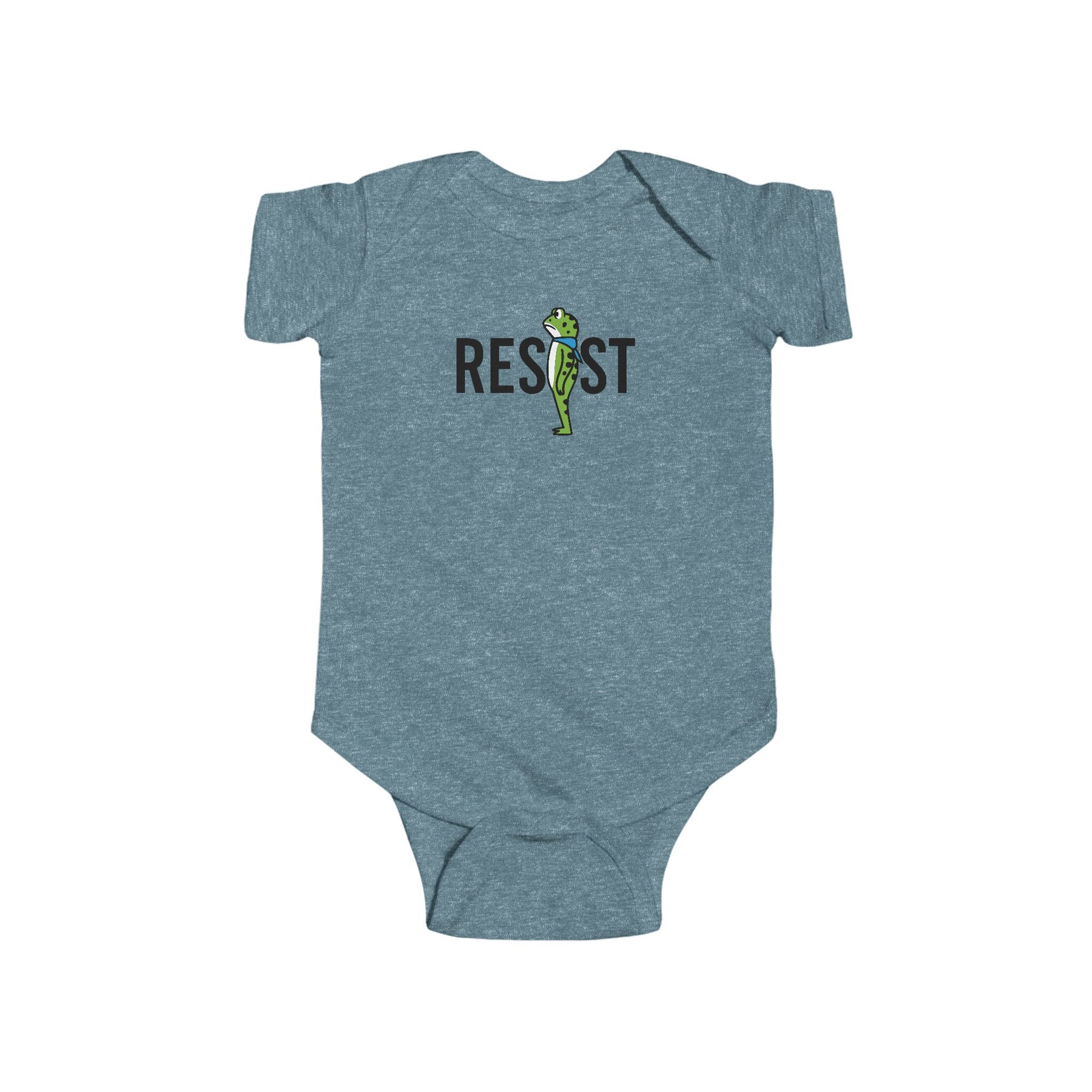 RESIST. The Portland frog standing as the "I"—tactical frivolity for the next generation. This infant bodysuit brings the legendary Portland ICE protest symbol to the smallest resisters, because it's never too early to stand against authoritarianism. Soft ring-spun cotton with snap closures at the crotch makes diaper changes easy while the frog spelling RESIST honors the moment when inflatable amphibians proved that sometimes the most effective protest makes tyranny look absurd. Parents who show up are raising kids who will too.