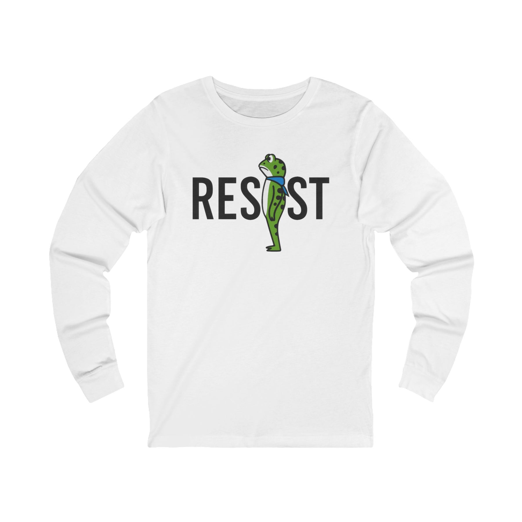 RESIST. The frog that stood up to ICE. This design honors the inflatable amphibian protesters who became symbols of defiance during October 2025 ICE protests in Portland—when federal agents pepper-sprayed a frog's air vent and created an indelible image of absurd state violence. The frog spelling the "I" in RESIST carries that tactical frivolity forward: making authoritarianism look ridiculous while staying in the fight. This classic Bella+Canvas long sleeve fits like a well-loved favorite for cooler weather rallies and organizing meetings.