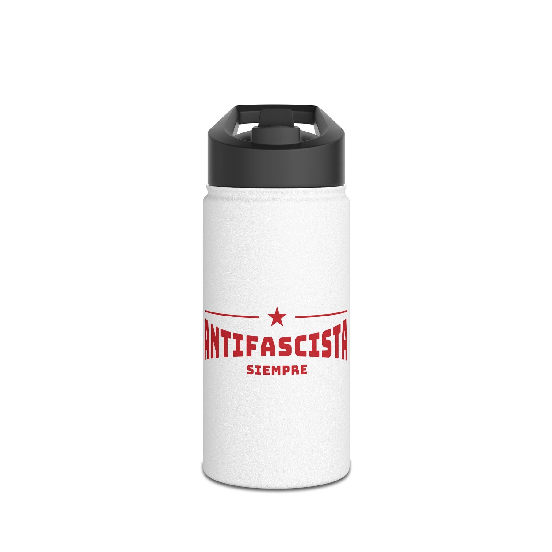 Antifascista Siempre. Always anti-fascist. Quench your thirst in style with this stainless steel water bottle. Bold design with the red star symbolizing solidarity and defiant hope—a declaration that resistance is non-negotiable. Yesterday, today, tomorrow, forever. Perfect for rallies, protests, or daily hydration with purpose. Available in 3 sizes (12oz, 18oz, 32oz) with double-wall stainless steel construction that keeps your drinks frosty for 24 hours and soothingly hot for 12 hours. This BPA-free water bottle comes with a twist-on lid for easy sipping, making it excellent for daily use at work, at college, in the car, at rallies, and beyond.
