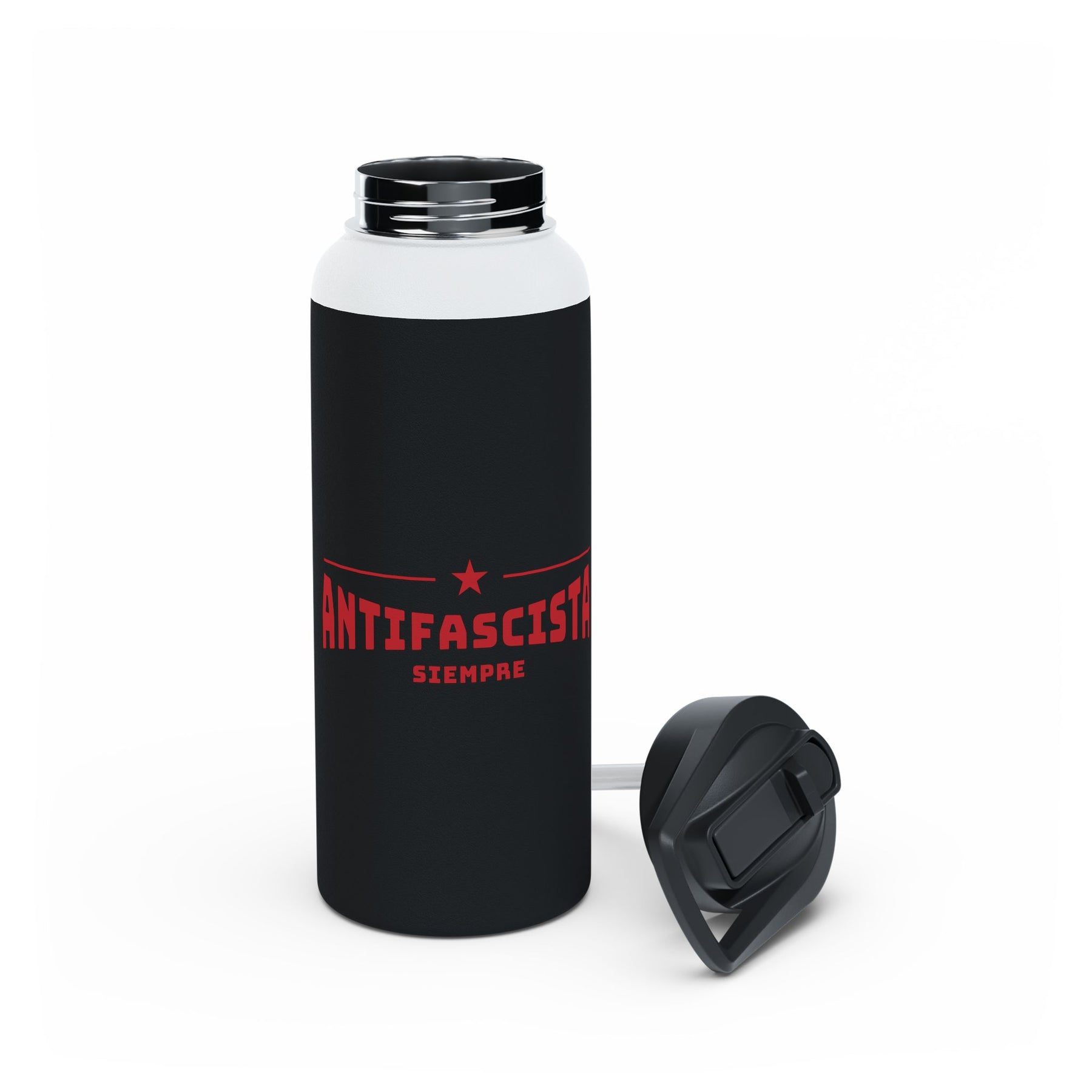 Antifascista Siempre. Always anti-fascist. Quench your thirst in style with this stainless steel water bottle. Bold design with the red star symbolizing solidarity and defiant hope—a declaration that resistance is non-negotiable. Yesterday, today, tomorrow, forever. Perfect for rallies, protests, or daily hydration with purpose. Available in 3 sizes (12oz, 18oz, 32oz) with double-wall stainless steel construction that keeps your drinks frosty for 24 hours and soothingly hot for 12 hours. This BPA-free water bottle comes with a twist-on lid for easy sipping, making it excellent for daily use at work, at college, in the car, at rallies, and beyond.