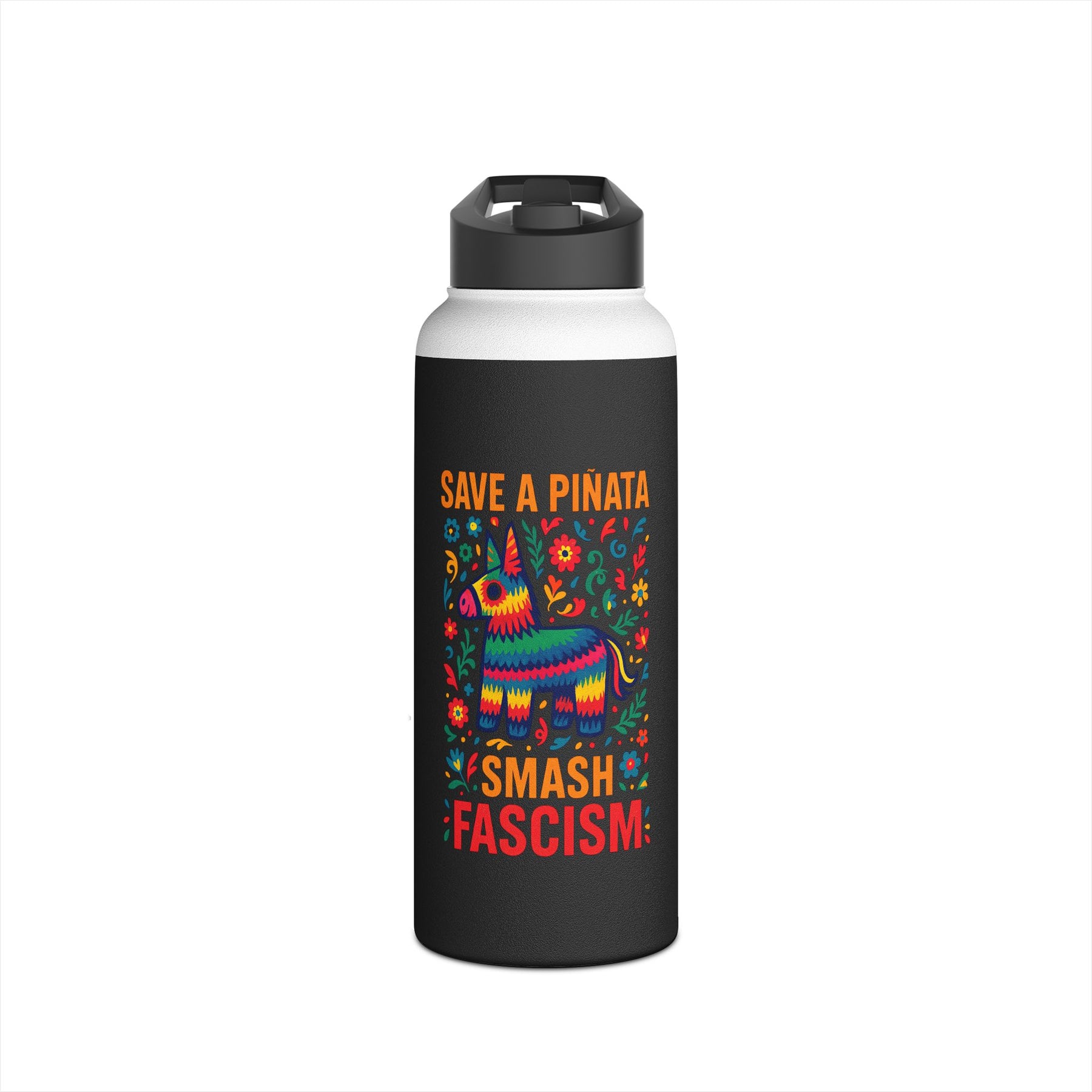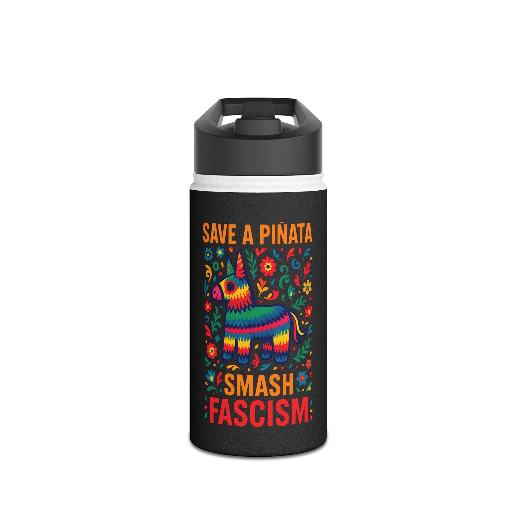 Stay hydrated while you redirect violence toward better targets. SAVE A PIÑATA, SMASH FASCISM wraps vibrant Mexican folk art around stainless steel—because even your water bottle can carry strategic wisdom about what deserves protecting and what deserves dismantling. The piñata survives, fascism doesn't. Double-wall vacuum insulation keeps water cold through rallies, organizing shifts, mutual aid distributions, or anywhere you're channeling festive energy toward productive resistance.