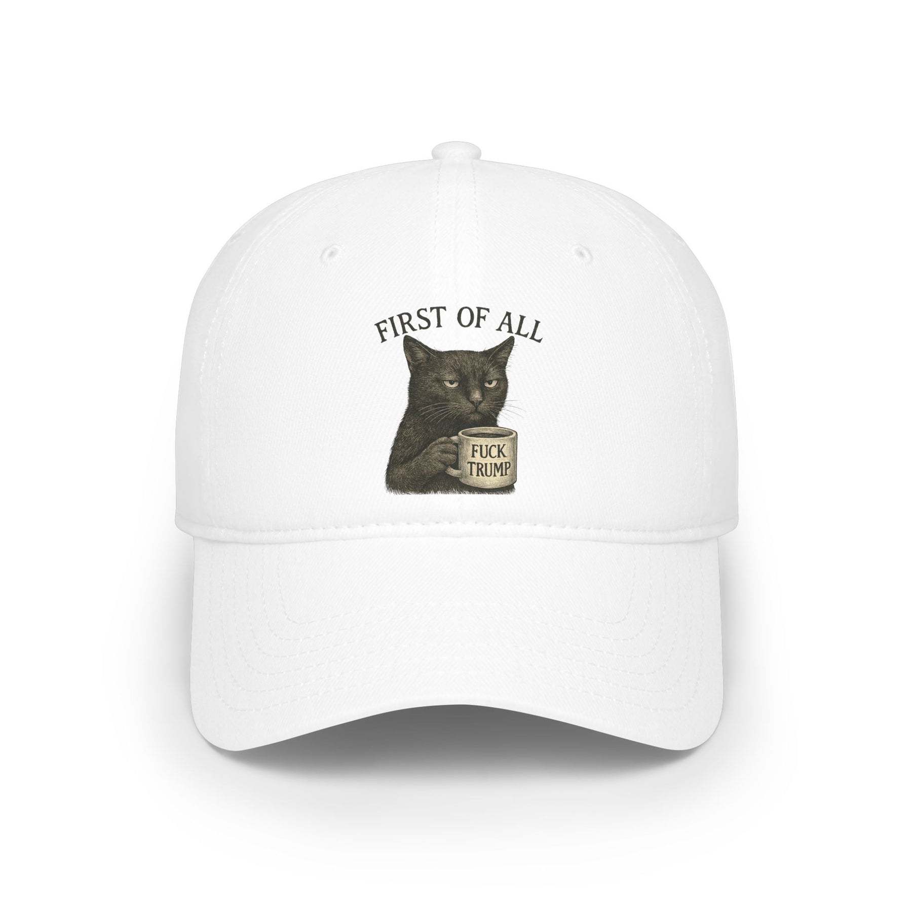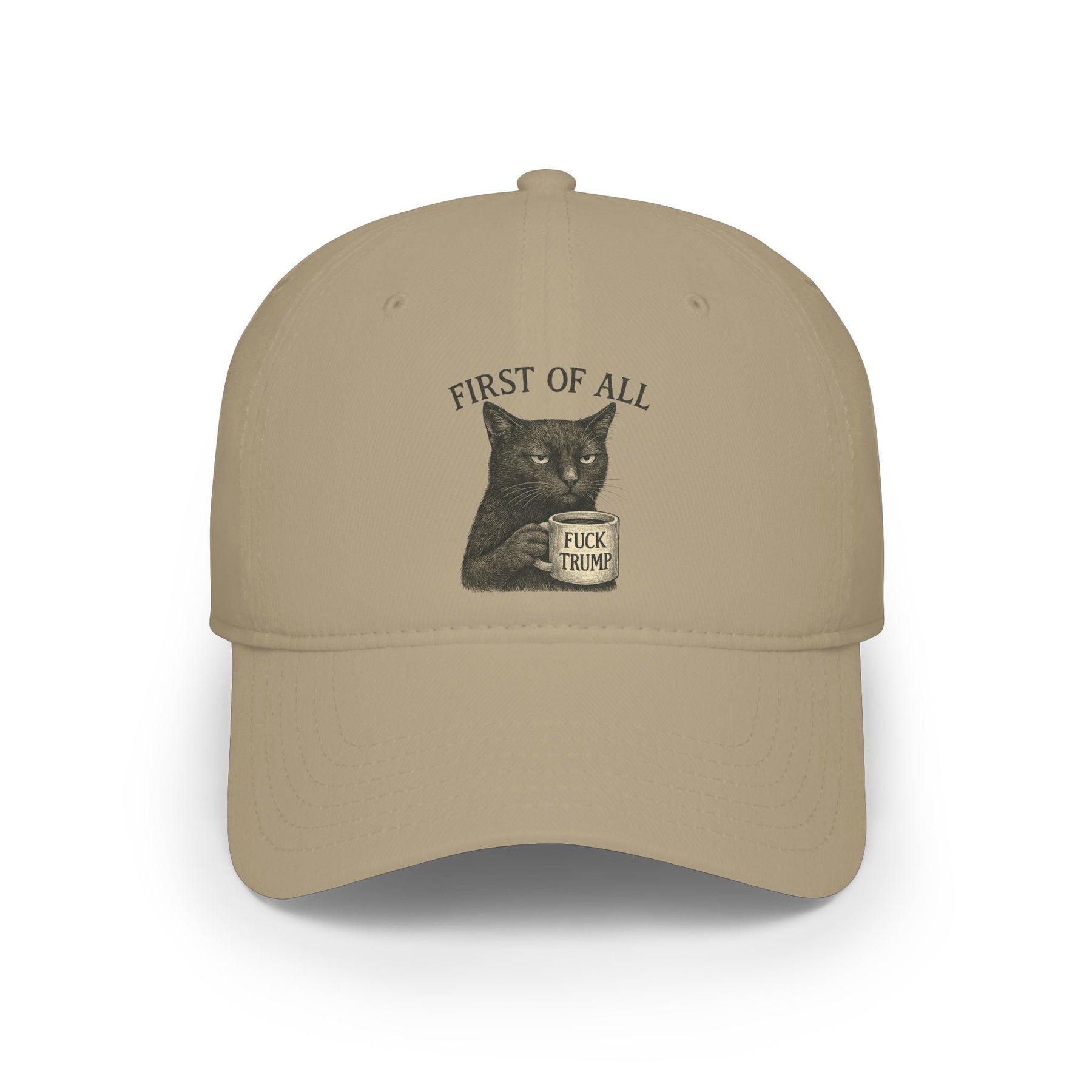 ✔️ First of All, F**k Trump Design – Black cat illustration with coffee mug message