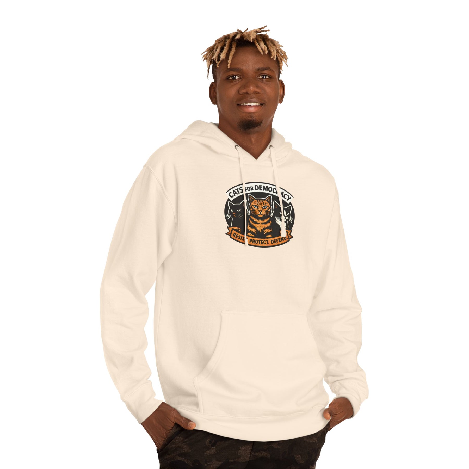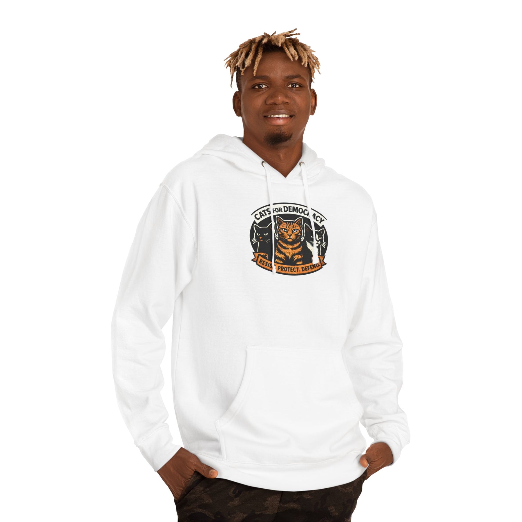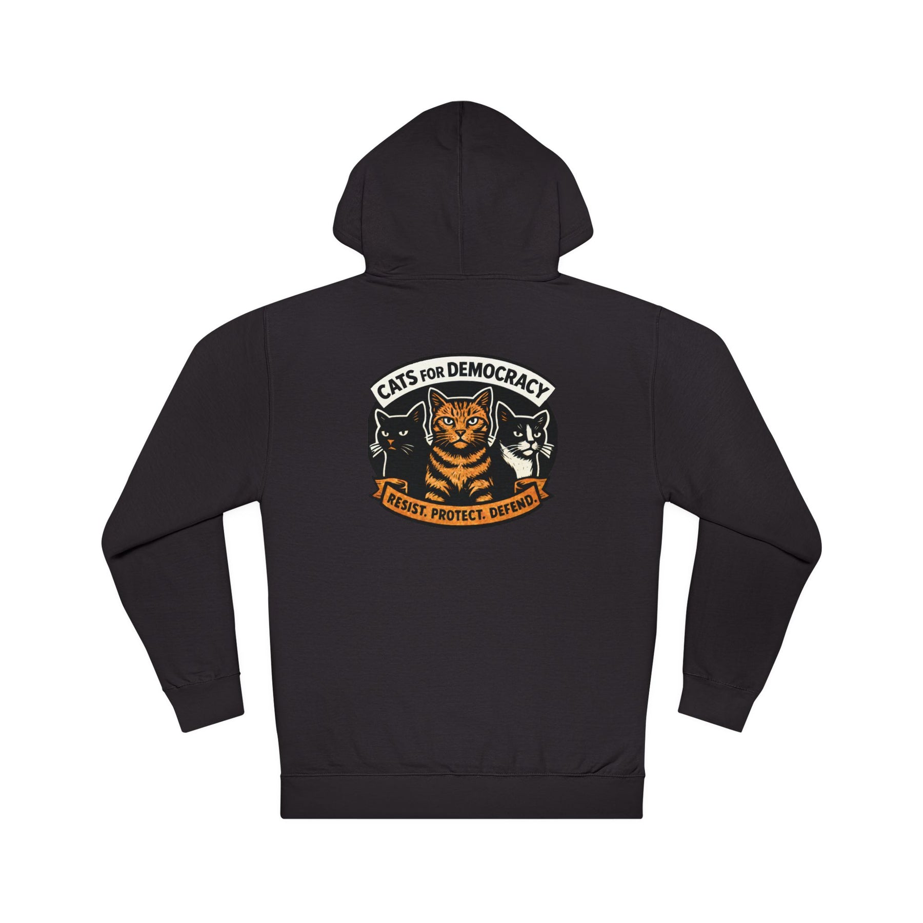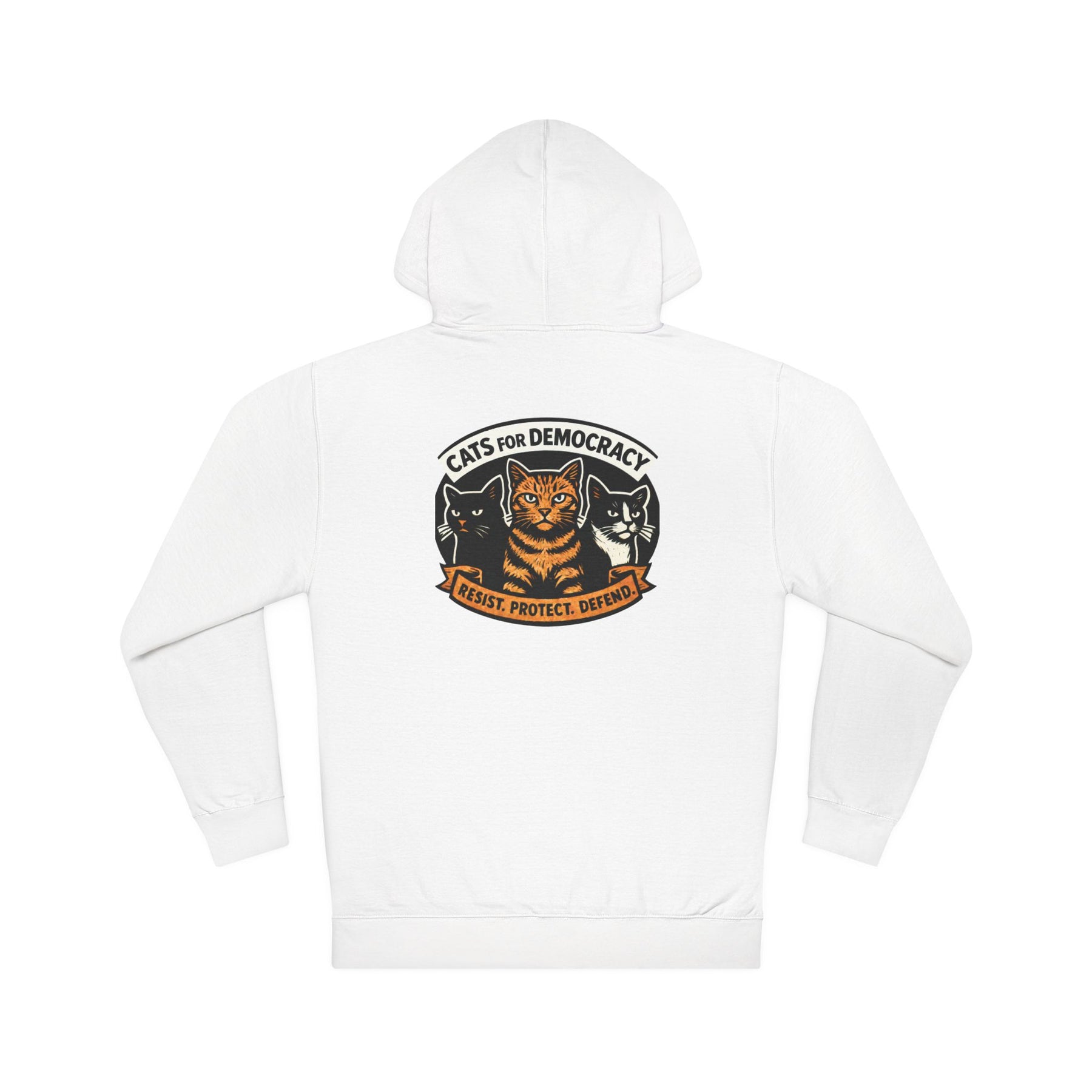 Cats for Democracy. RESIST, PROTECT, DEFEND. Three cats standing united—orange tabby, black cat, tuxedo cat—forming the feline coalition for democratic values. This bold poster-style design channels your cat's natural instinct to judge authoritarianism into wearable resistance. Built from soft cotton-poly fleece with a kangaroo pocket for cold-weather rallies, organizing meetings, or anywhere you're representing the cats who've been silently judging tyranny from the windowsill all along.