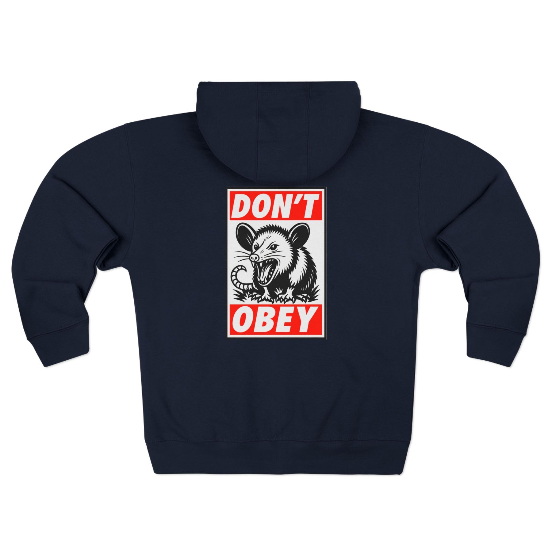 Don't Obey. Nature's least compliant creature delivering the message in bold Shepard Fairey-inspired propaganda style. This opossum knows that obedience to tyranny deserves exactly zero respect—just teeth and hissing. The iconic red and black street art aesthetic meets practical full-zip design for rallies where you need to layer up, layer down, and never back down. Built from soft cotton-poly fleece that works when the fight requires both warmth and the refusal to normalize authoritarianism.