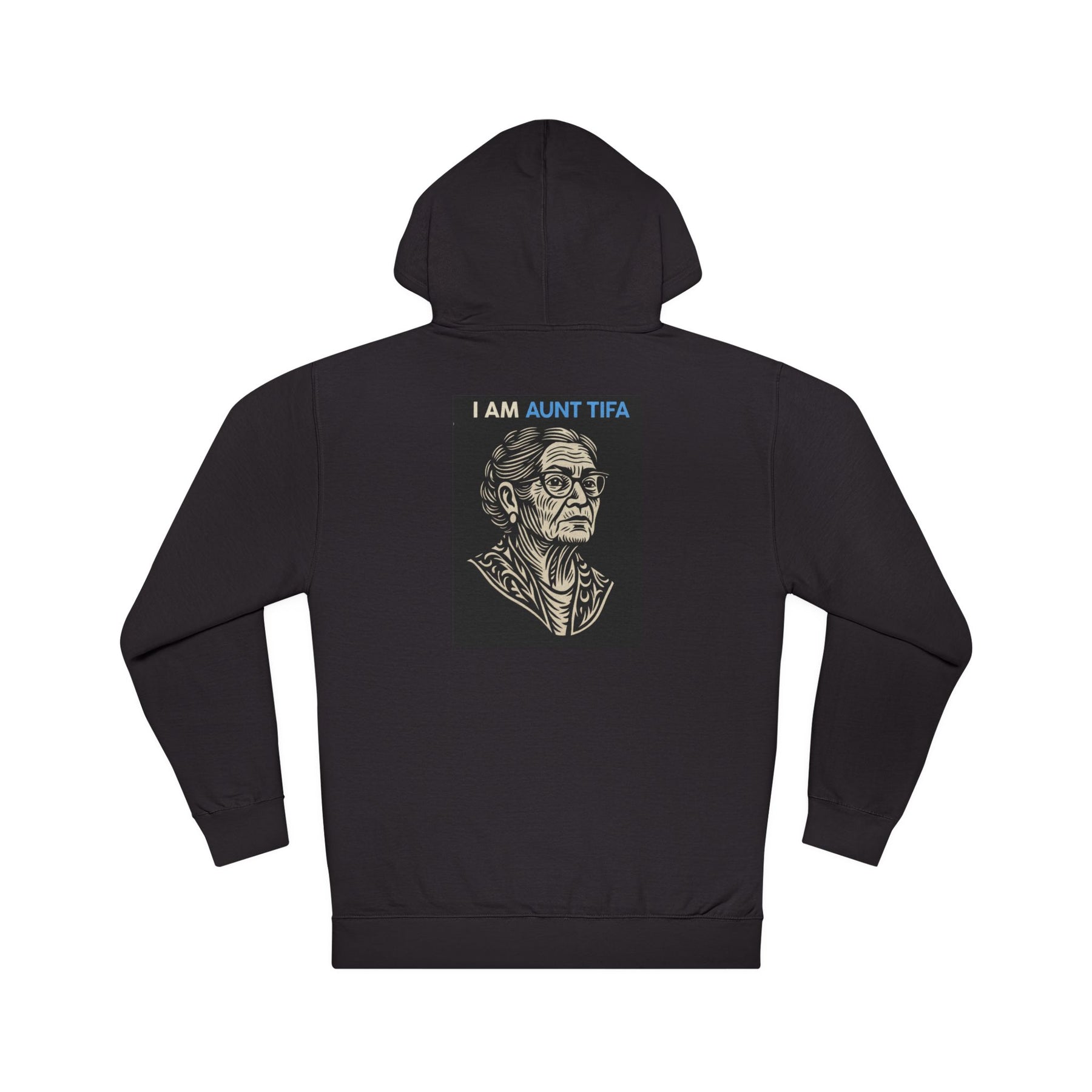 Meet Aunt Tifa—knitting enthusiast, cat lover, patriarchy destroyer. Trump's most feared "organization" is actually just regular people who think fascism sucks. This I Am Aunt Tifa hoodie turns right-wing paranoia into a punchline. When they're busy looking for a non-existent terrorist network, we're out here living our lives and standing up for democracy. Made from a soft cotton-polyester fleece blend, this hoodie delivers comfort and durability for rallies, marches, and everyday resistance with a sense of humor.
