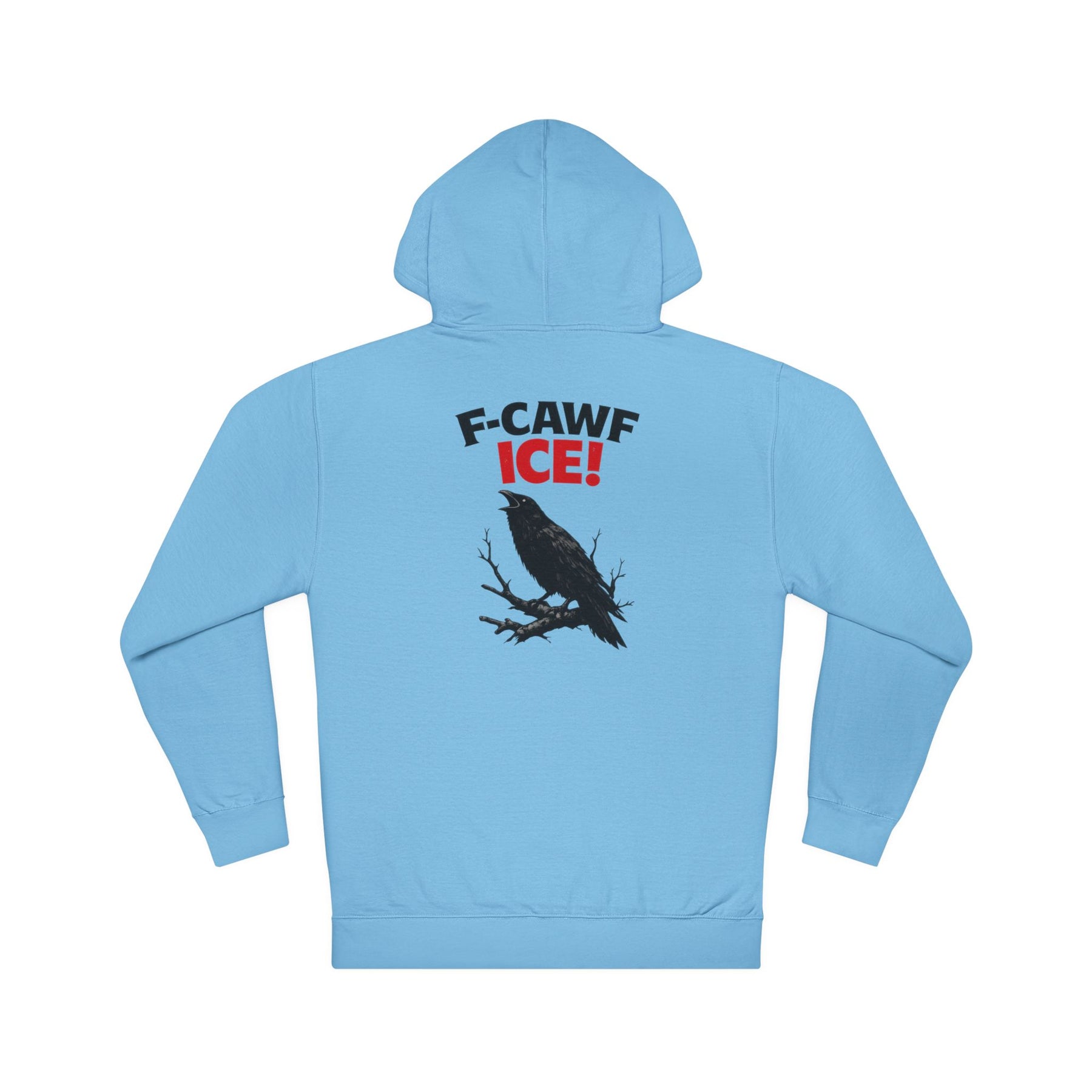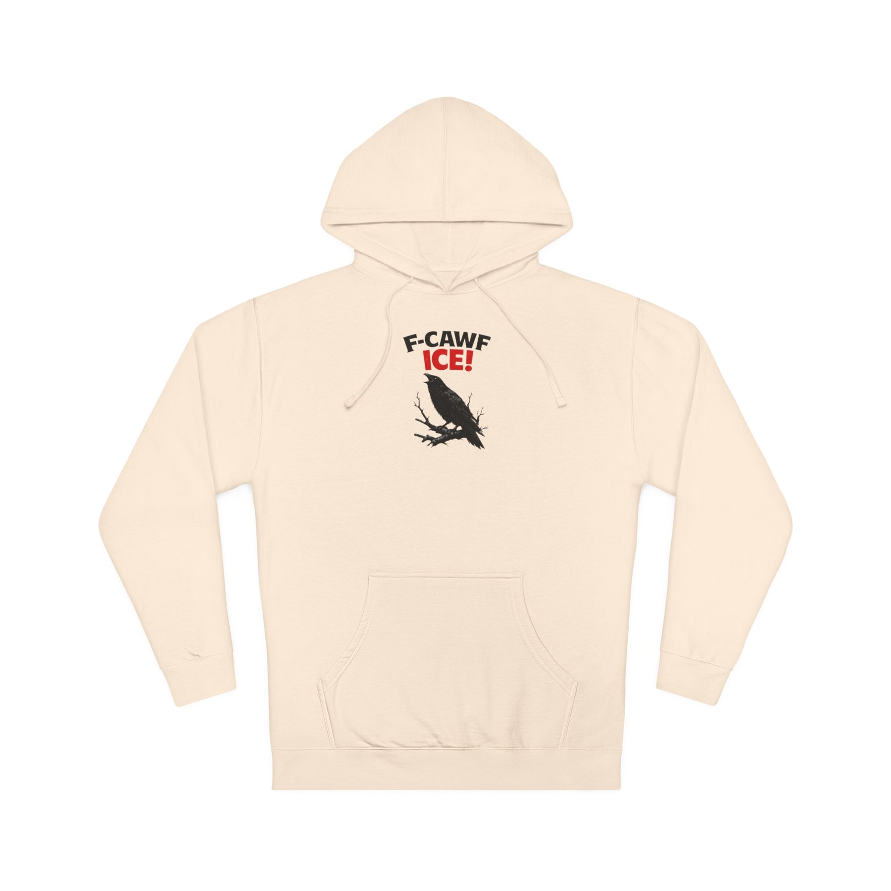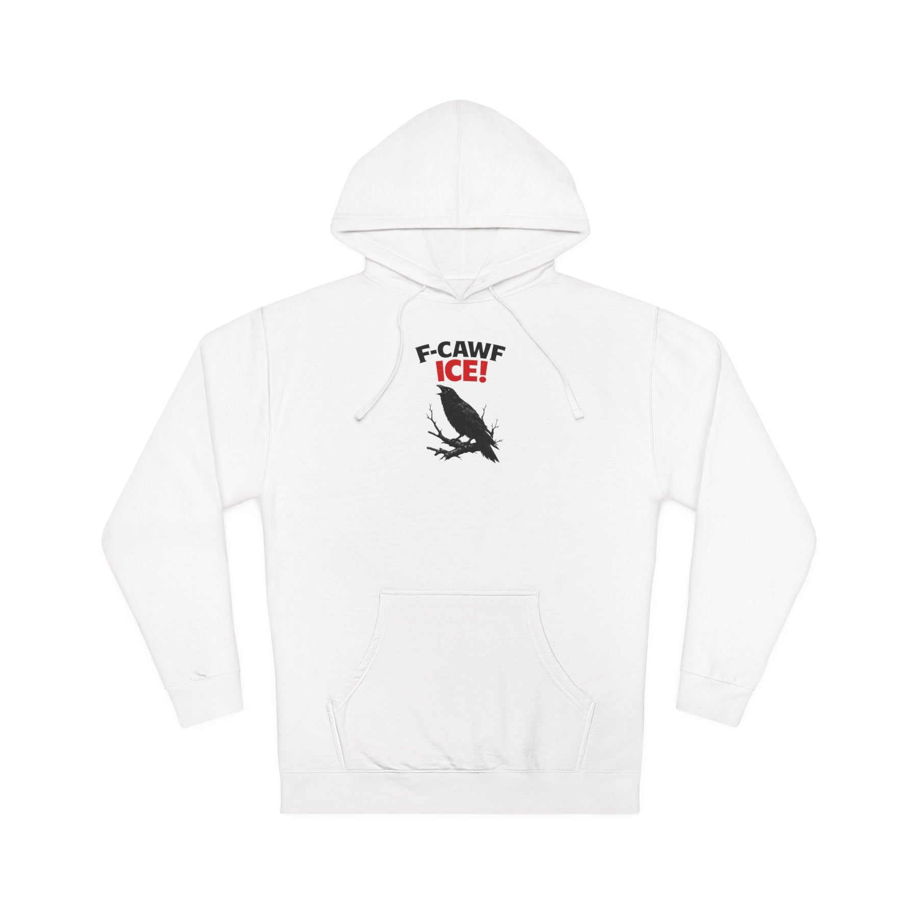 F-CAWF ICE! Read it out loud—the crow already did. This isn’t clever for fun; it’s pissed on purpose. A crow mid-call, red ICE staring back, punctuation where restraint ends. The joke lands because the reality is inhumane, and humor is the fastest way to say what shouldn’t need explaining. It’s sharp, readable, and intentionally impatient with politeness. Printed on a substantial unisex pullover hoodie, it wears solid, keeps its shape, and holds the line in regular rotation.