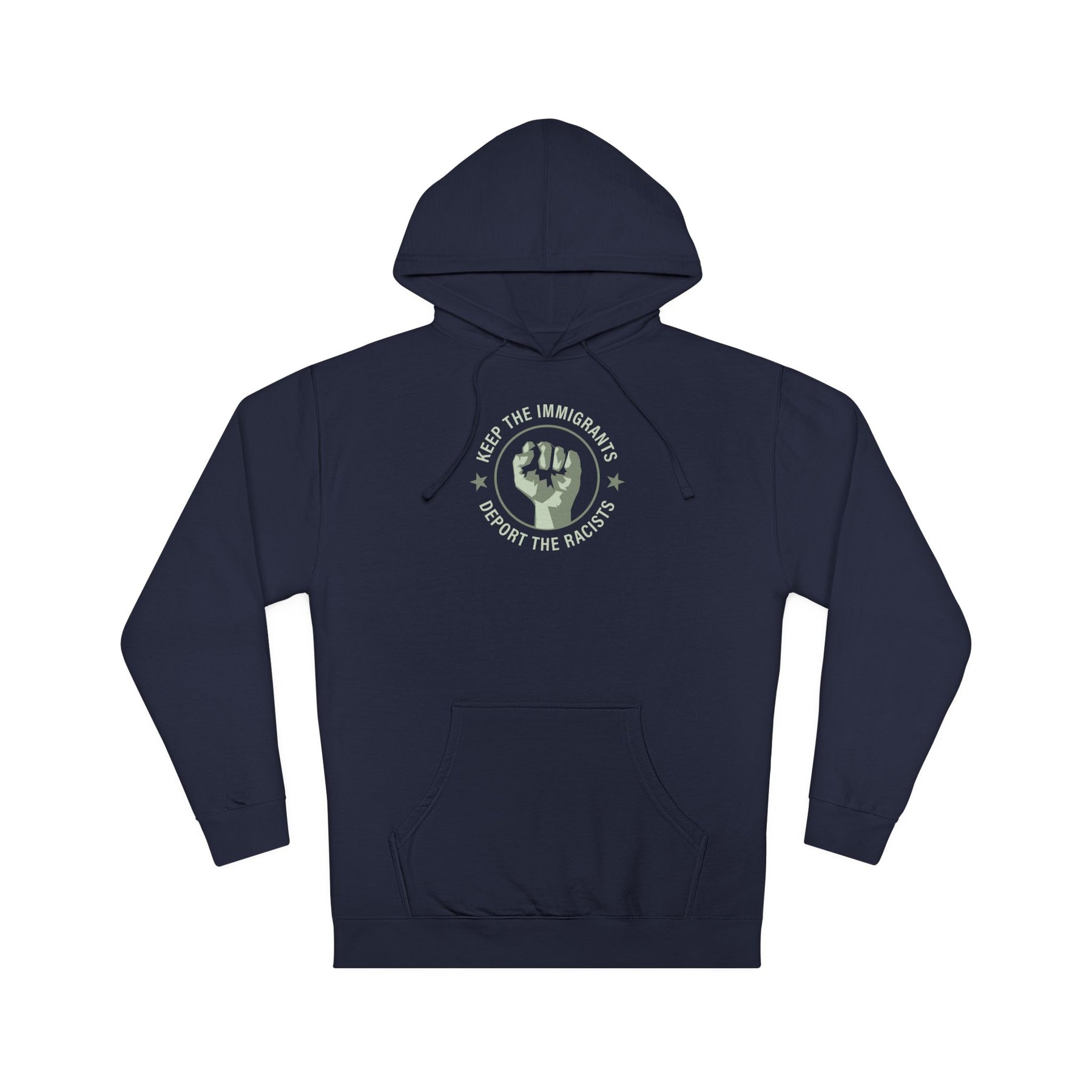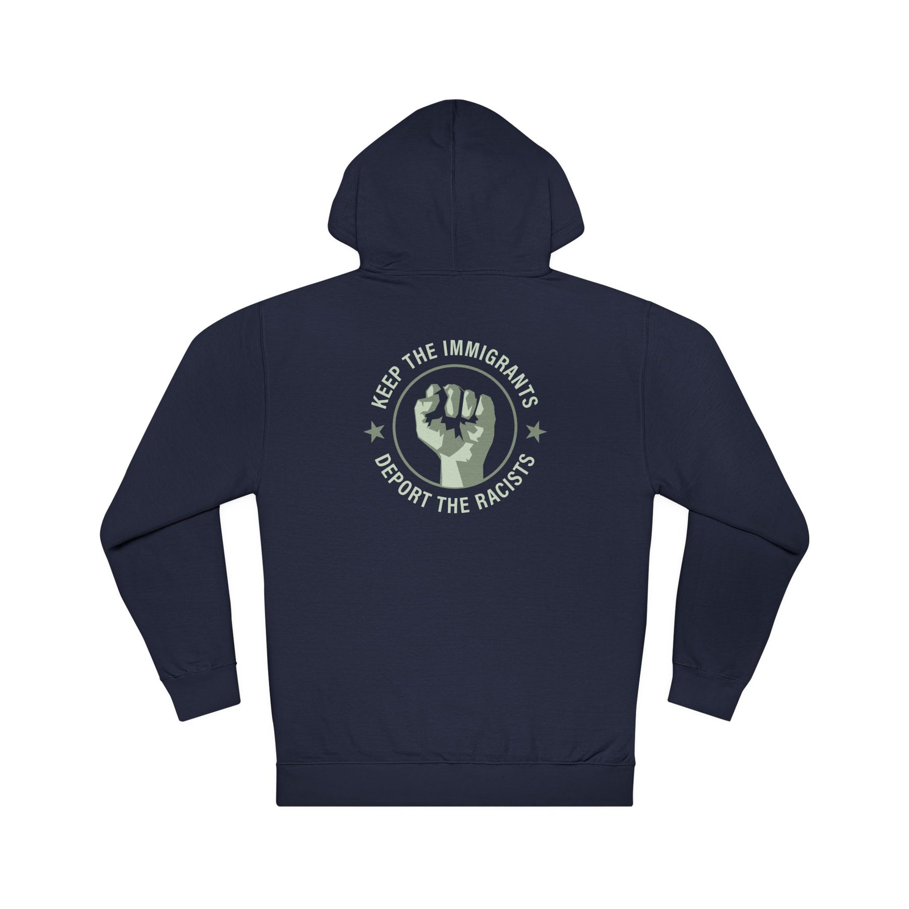 This hoodie is for those who refuse to let white supremacy define who belongs. Wear it as your declaration that borders are violence, that immigration is not a crime, and that racism has no place in a free society. Keep the immigrants. Deport the racists.