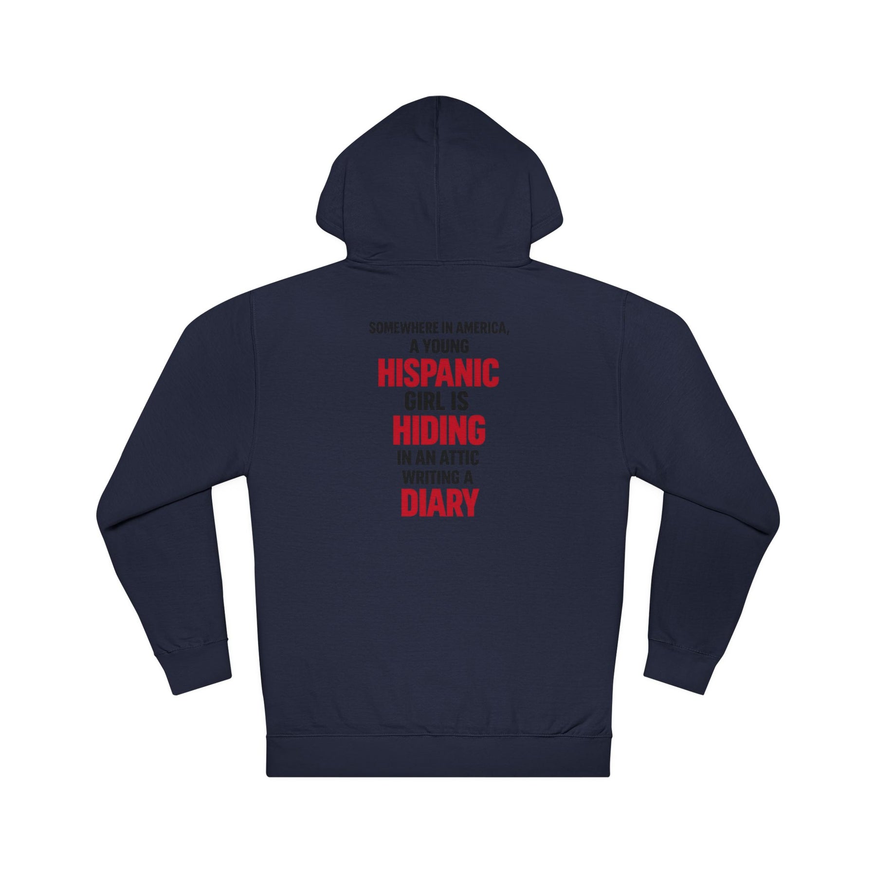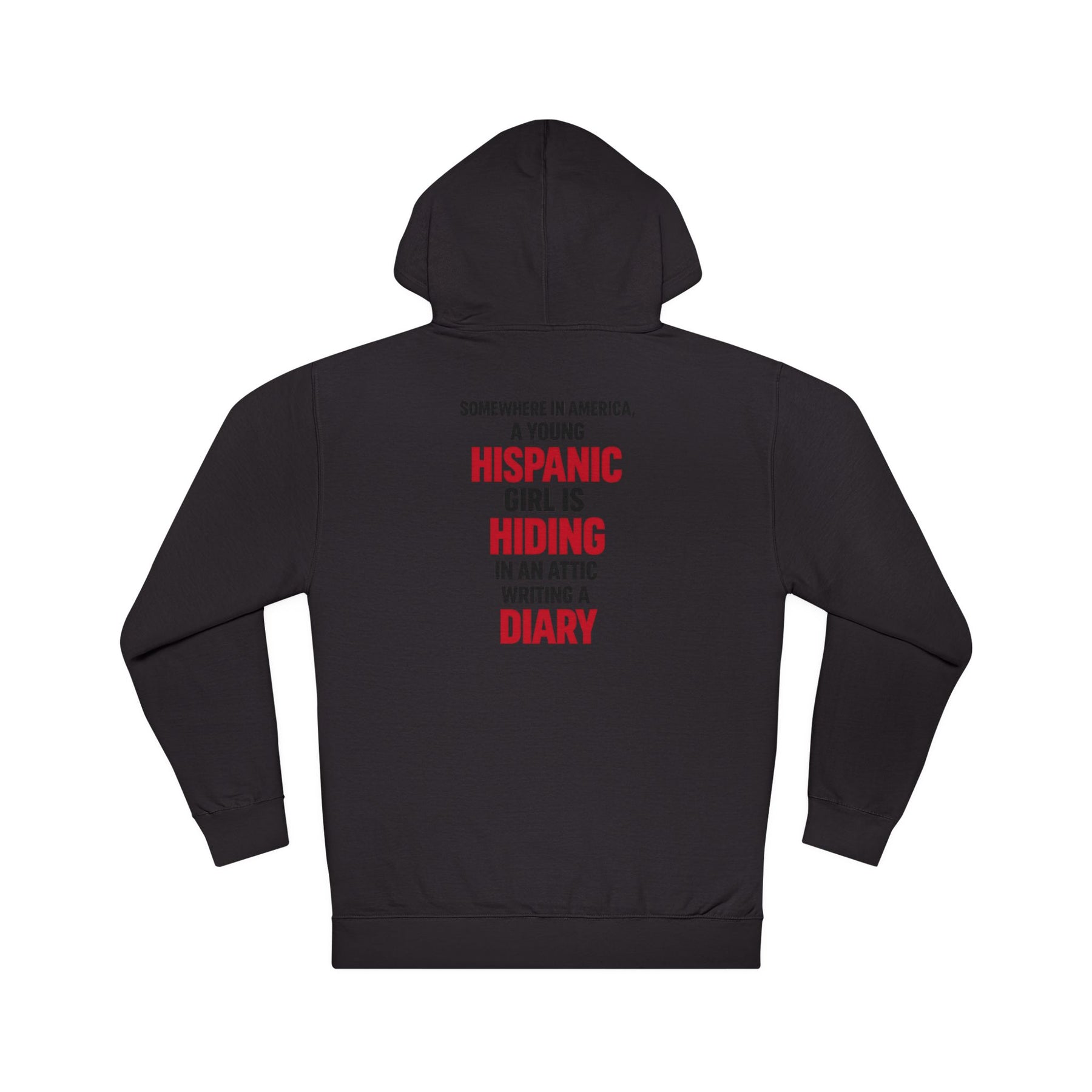 Somewhere in America, a young Hispanic girl is hiding in an attic writing a diary. The sentence is deliberate. It reaches back to a history we were promised would never echo this way again. This design doesn’t soften the comparison or hide behind symbolism. The red words interrupt on purpose. It’s a warning printed plainly, refusing to let comfort blur what’s happening now.