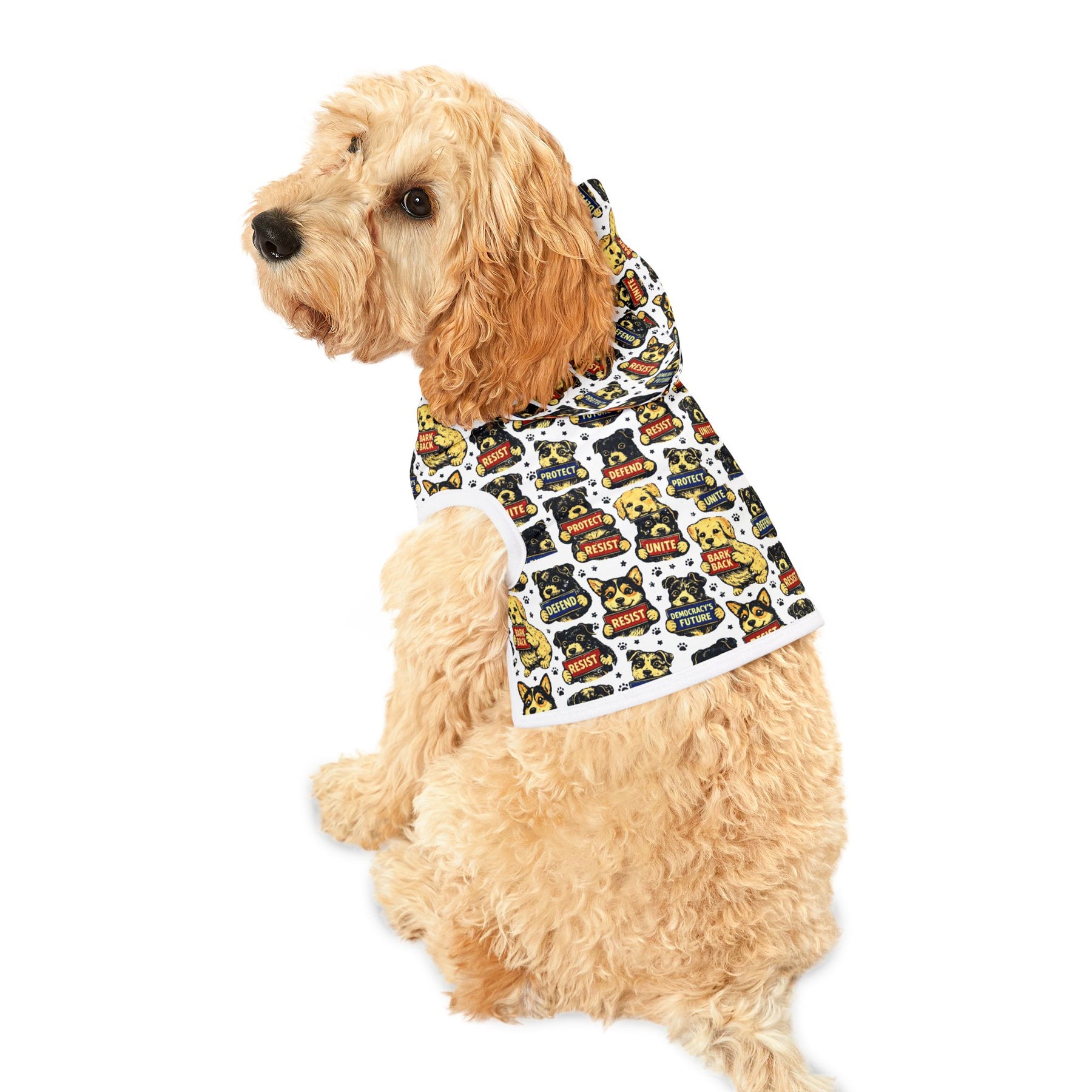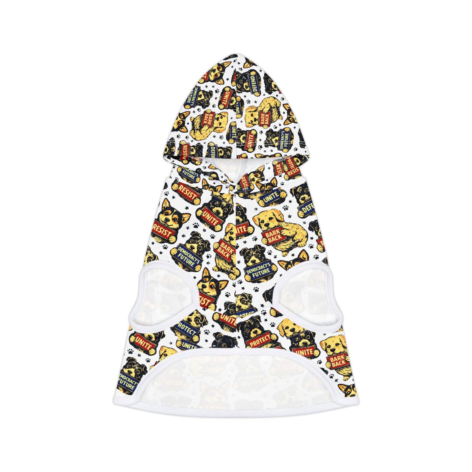 The Pawsistance. Puppies of all breeds covered in RESIST, UNITE, DEFEND, PROTECT, BARK BACK, and PROTECT THE FUTURE badges—because your dog has better instincts about authoritarianism than most humans. Every walk becomes a statement when the pack joins the movement. Soft cotton-poly blend with adjustable hood for dogs who take resistance seriously.