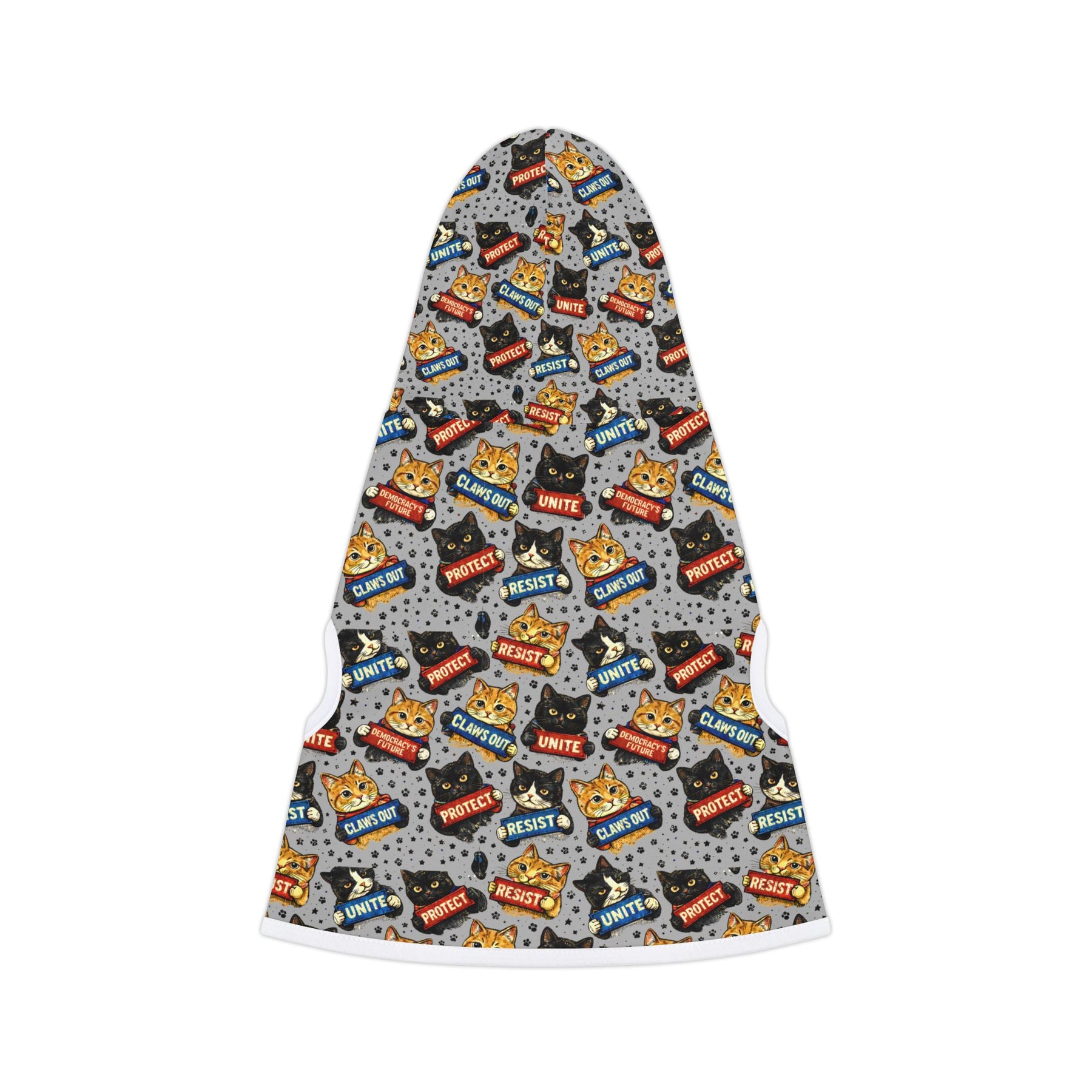The Purr-sistence. Kittens of all colors covered in RESIST, UNITE, PROTECT, CLAWS OUT, and DEMOCRACY'S FUTURE badges—because your cat has been silently judging authoritarianism from the windowsill since birth, and frankly, they're done being subtle about it. Every strut becomes a statement when the feline resistance joins the movement. Soft cotton-poly blend with adjustable hood for cats who've decided that knocking things off tables isn't enough—democracy needs defending, naps can wait.