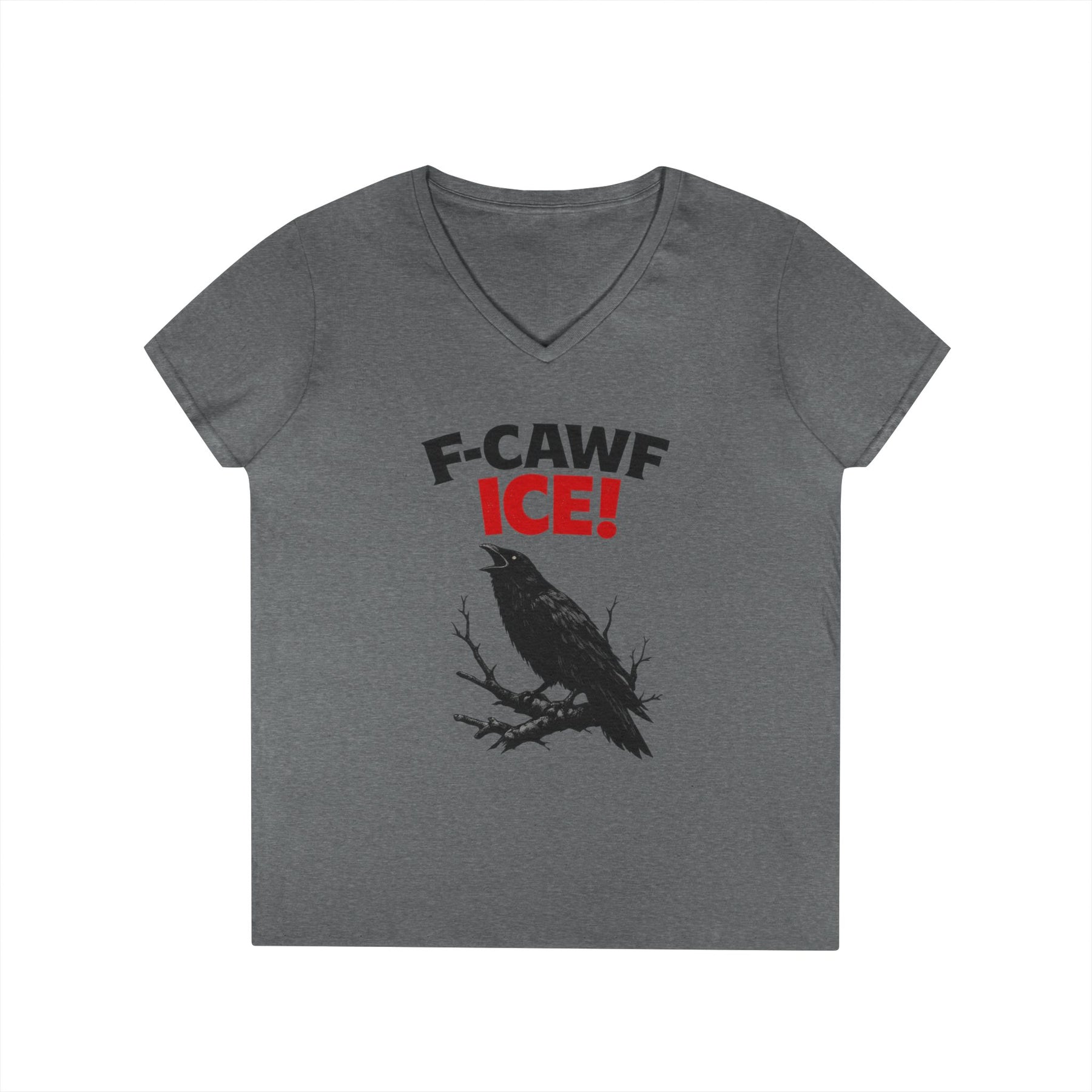 F-CAWF ICE! Read it out loud—the crow already did. This isn’t clever for fun; it’s pissed on purpose. A crow mid-call, red ICE staring back, punctuation where restraint ends. The joke lands because the reality is inhumane, and humor is the fastest way to say what shouldn’t need explaining. It’s sharp, readable, and intentionally impatient with politeness. Printed on a lightweight women’s V-neck with a semi-fitted cut, the shirt wears clean, holds its shape, and stays comfortable in regular rotation.