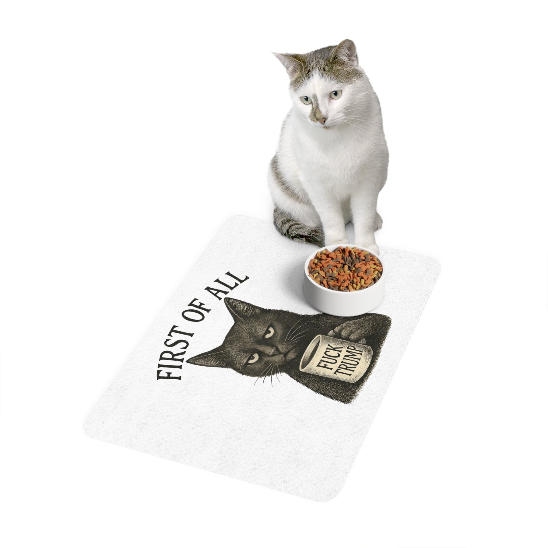 First of all, F**k Trump. The black cat doesn’t soften the message for mealtime. Coffee mug swapped for a food bowl, the contempt stays intact. This design treats disgust as a rational response and profanity as accuracy—even on the floor. No civility theater. No euphemisms. Just a clear statement about power, ego, and the damage left behind, now stationed where your cat already passes judgment.