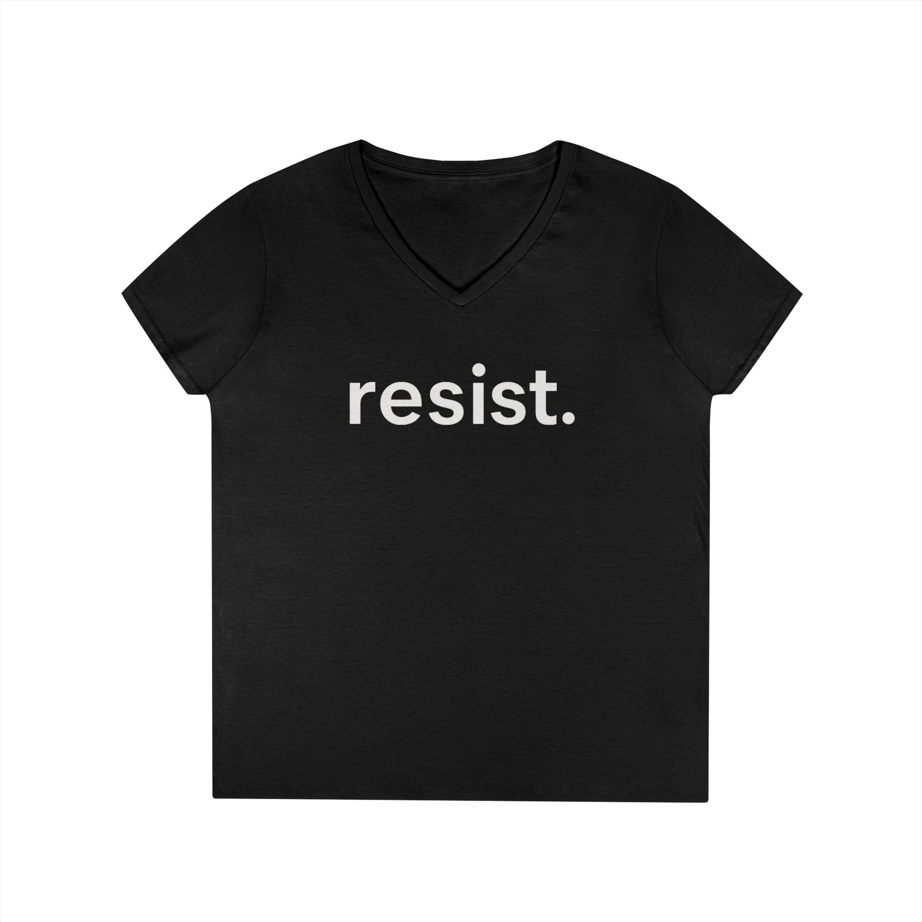 Resist. One word, lowercase, final. No polish, no persuasion—just the directive that applies when authoritarianism becomes routine. This design keeps the message spare and unsoftened, because resistance isn’t about presentation, it’s about follow-through. Cut in a women’s v-neck silhouette for everyday wear when you’re done explaining why democracy requires participation.