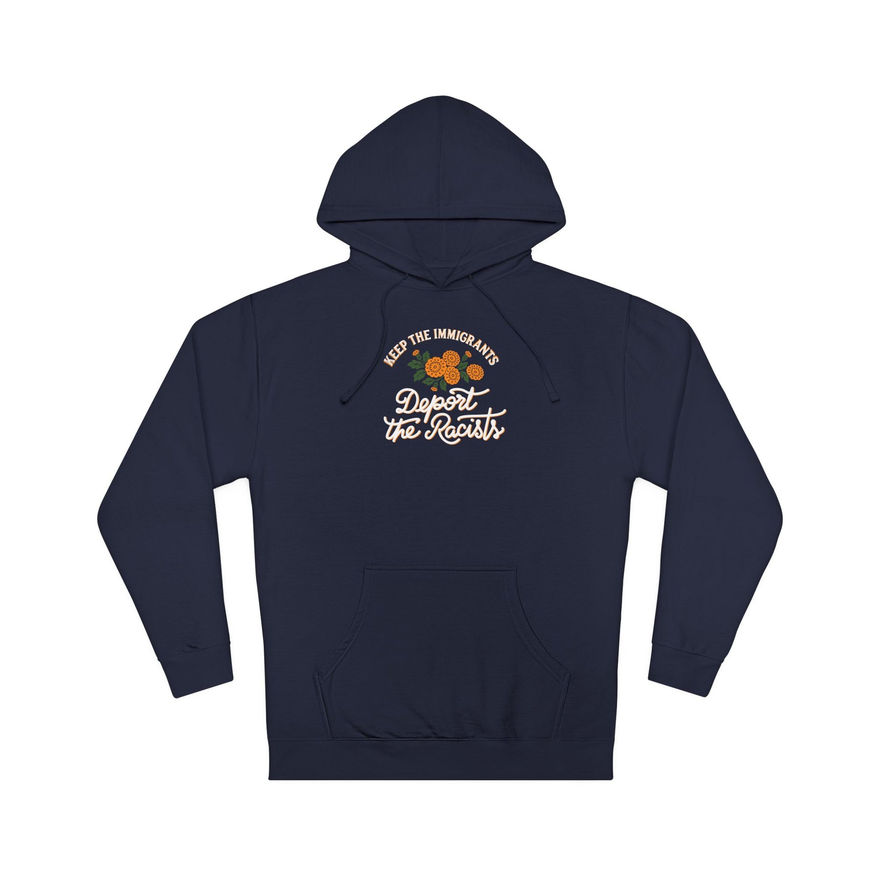 This hoodie is for those who refuse to let white supremacy define who belongs. Wear it as your declaration that borders are violence, that immigration is not a crime, and that compassion builds stronger communities than hate ever will. Keep the immigrants. Deport the racists.