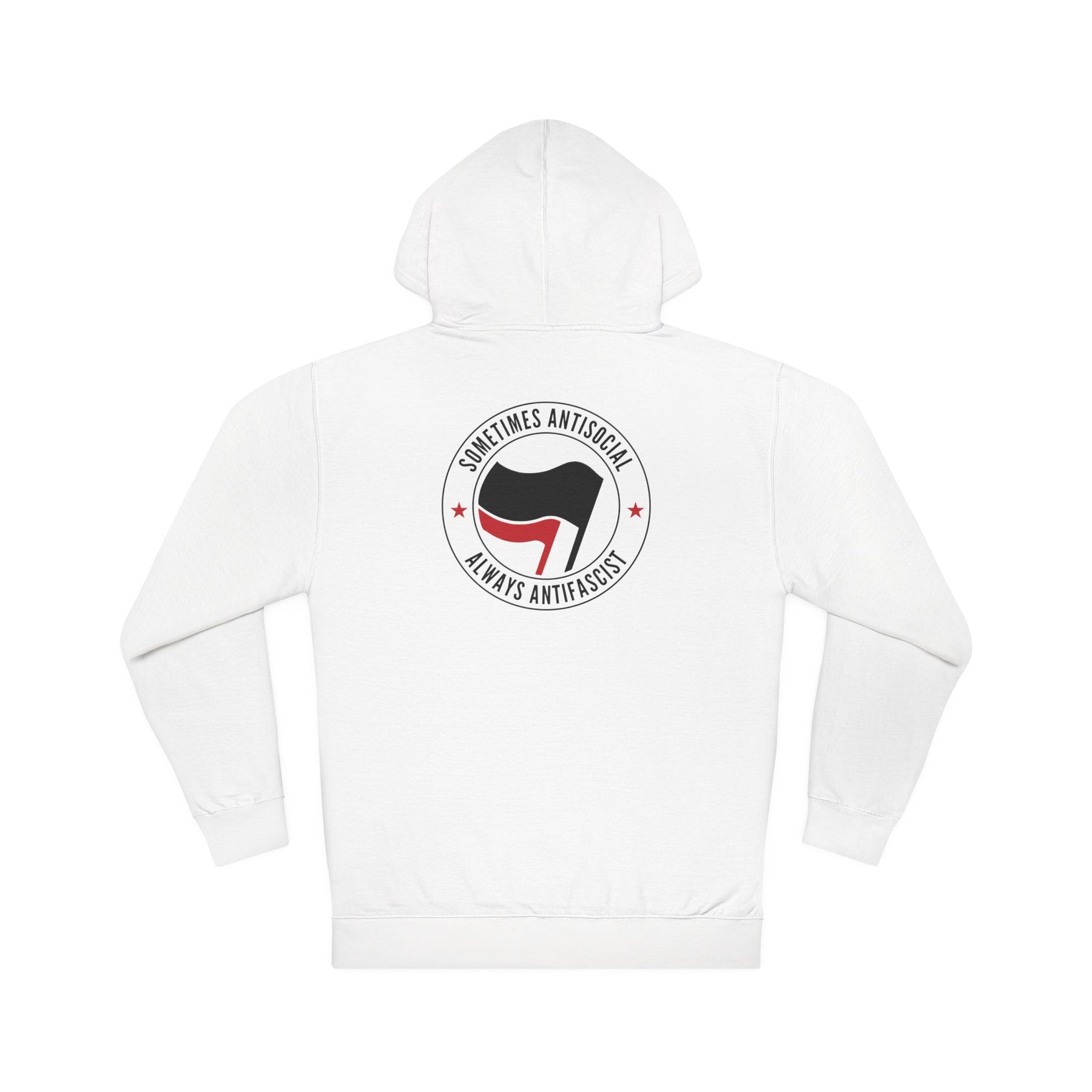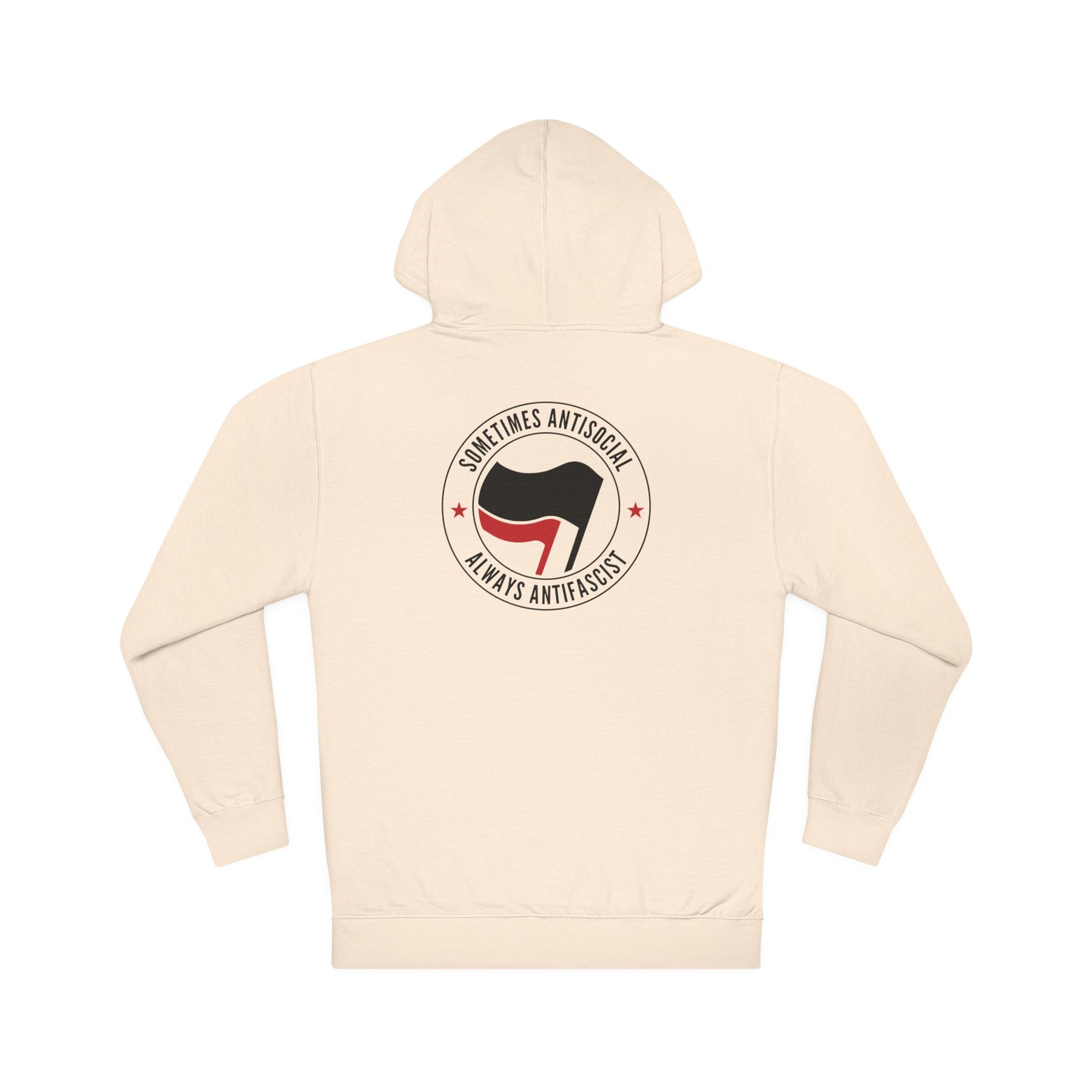 You don't owe fascists your time, your energy, or your patience. Sometimes anti-social is the only reasonable response to authoritarianism that demands you play nice. This hoodie features the iconic anti-fascist flag with a message that's perfectly clear: your refusal to engage with tyranny isn't a character flaw—it's a boundary. Perfect for cold-weather protests, rallies, or any day you'd rather pull up your hood than put up with fascist nonsense.