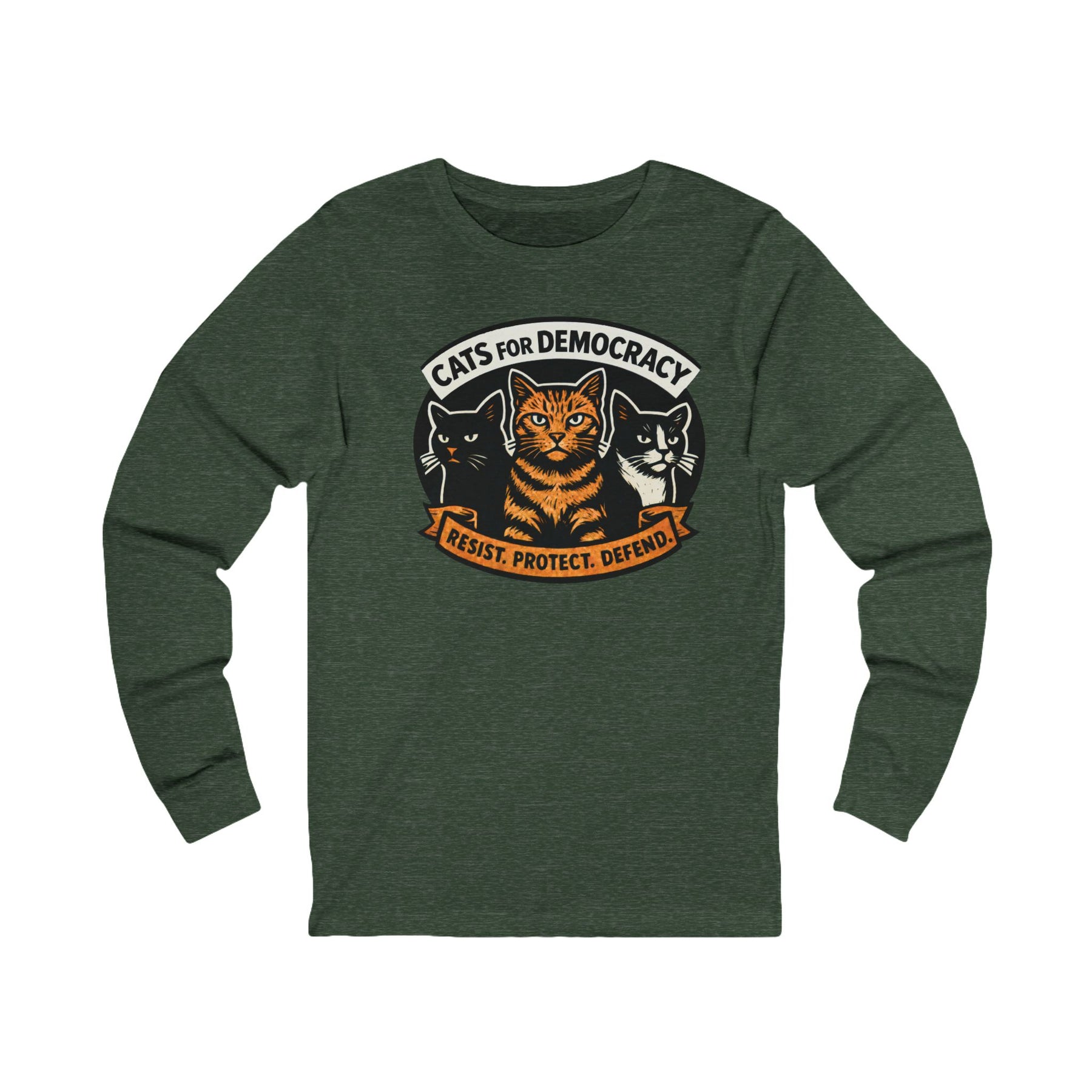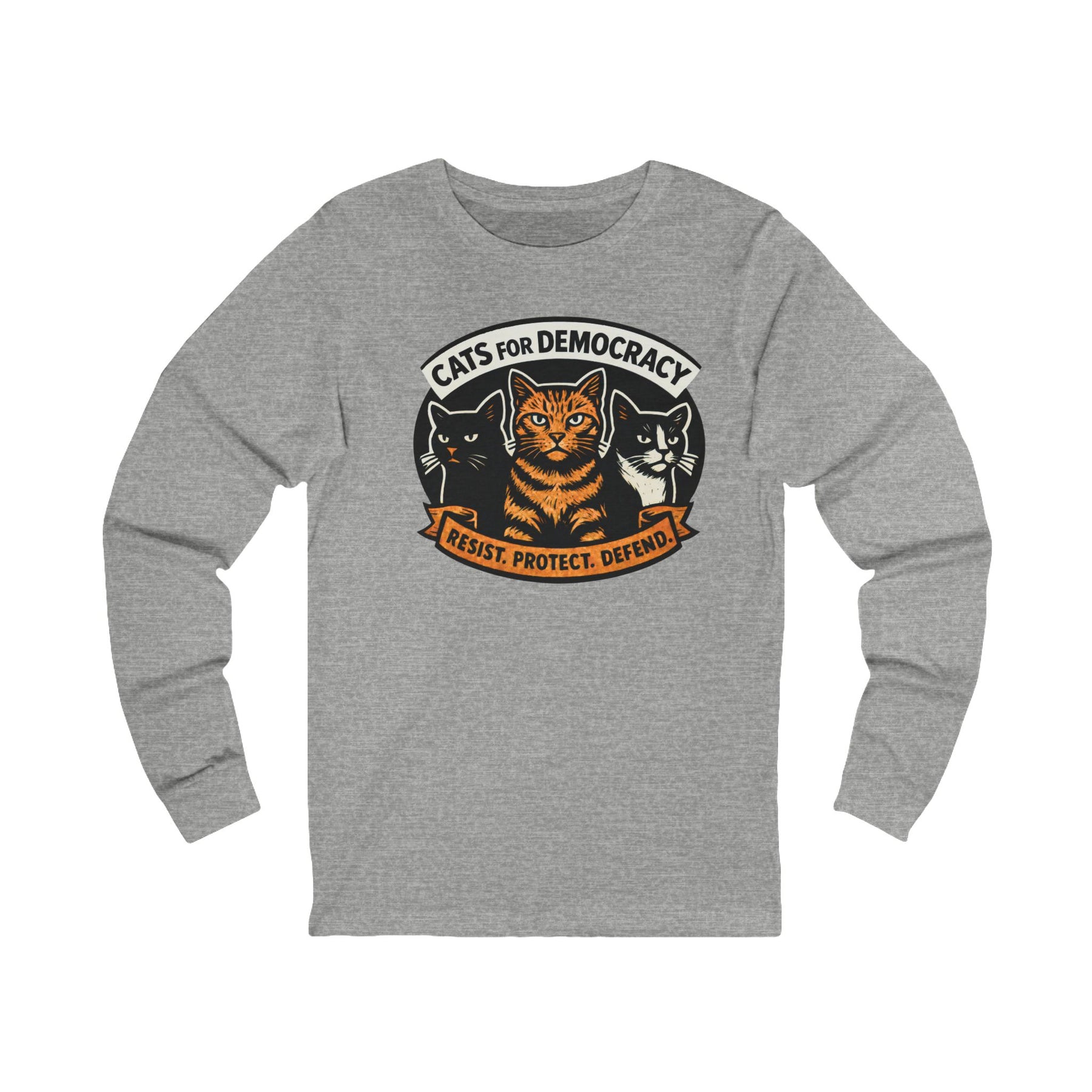Cats for Democracy. RESIST, PROTECT, DEFEND. Three cats standing united—orange tabby, black cat, tuxedo cat—forming the feline coalition for democratic values. This bold poster-style design channels your cat's natural instinct to judge authoritarianism into wearable resistance. Made from soft Bella+Canvas cotton with long sleeves for cooler weather rallies, organizing sessions, or anywhere you're representing the cats who've been silently judging tyranny from the windowsill all along.