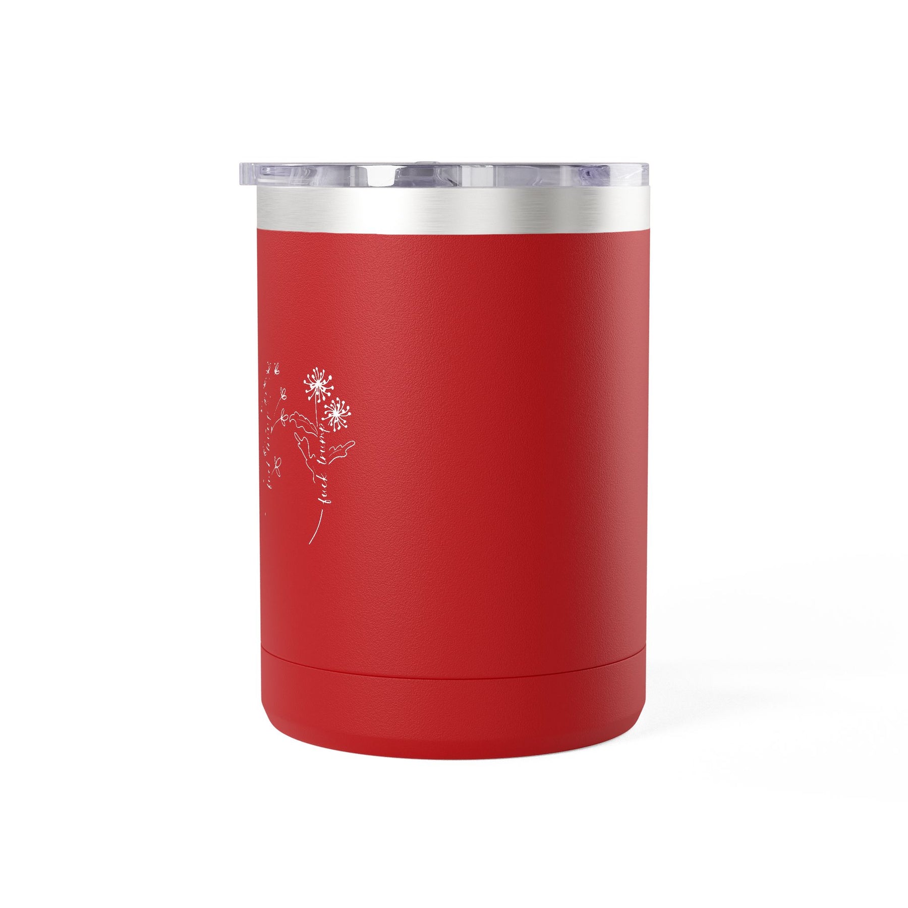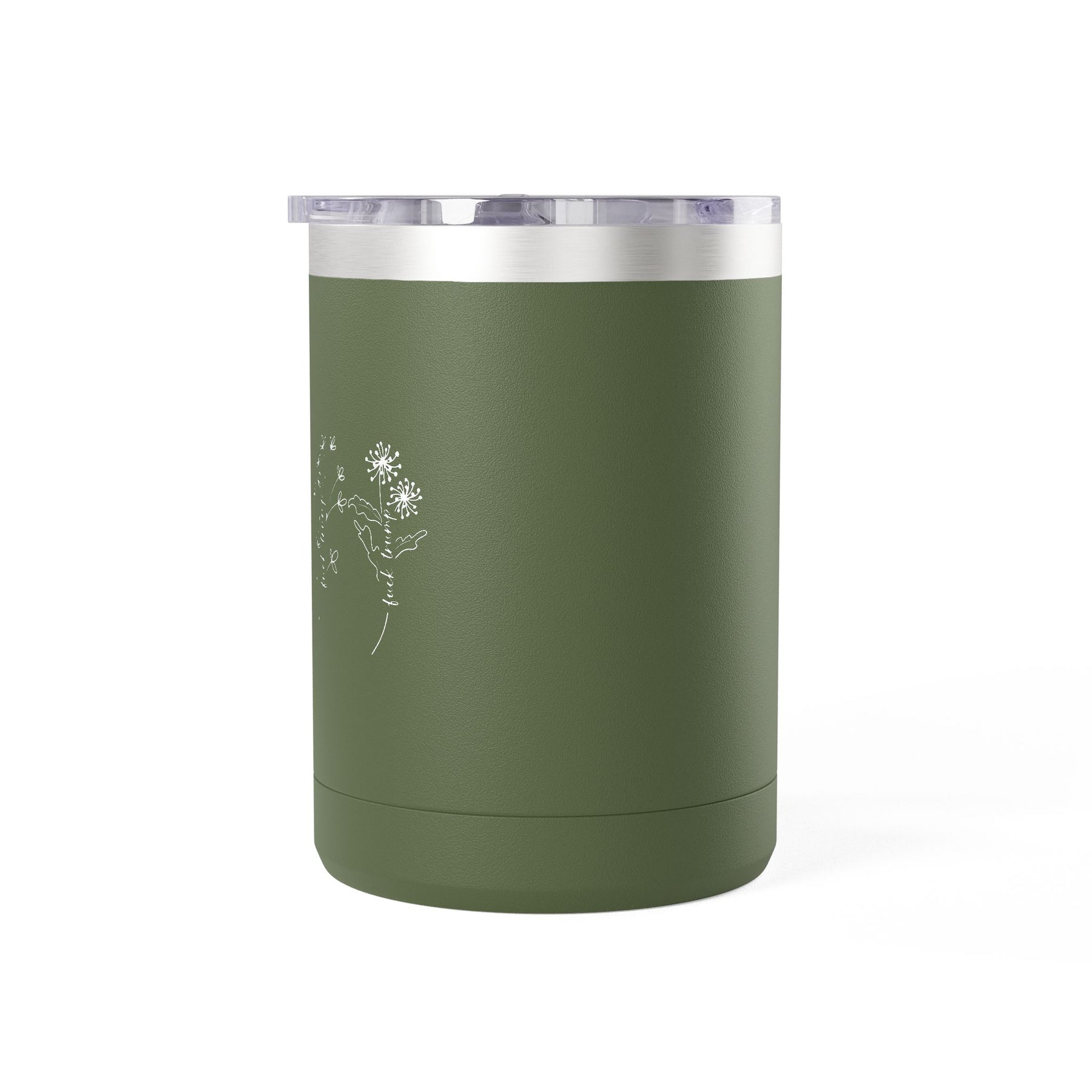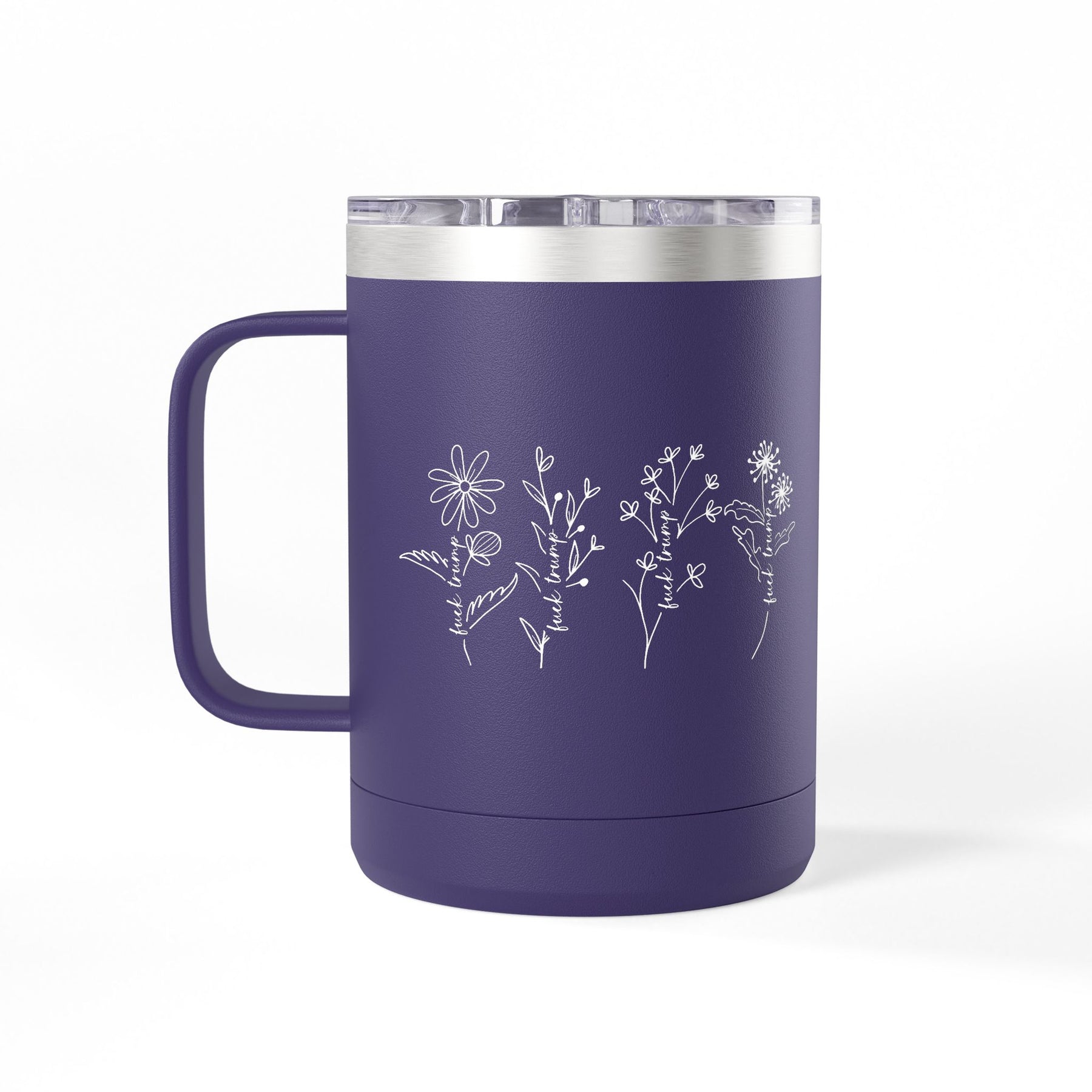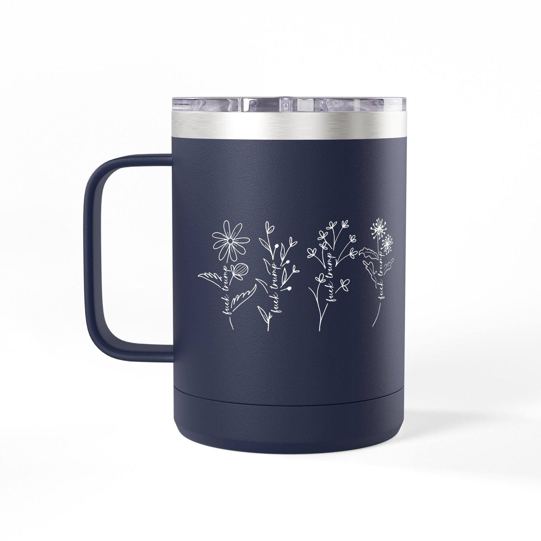Delicate wildflowers spelling out what needs saying, botanical beauty delivering unambiguous politics. This hand-drawn floral design wraps the message in petals—nature's most elegant way to state what polite company won't but democracy requires. The stems carry the directive plainly while the flowers keep it beautiful. Double-wall insulation keeps your coffee hot through commutes, organizing meetings, or anywhere you're channeling rage into something that grows.