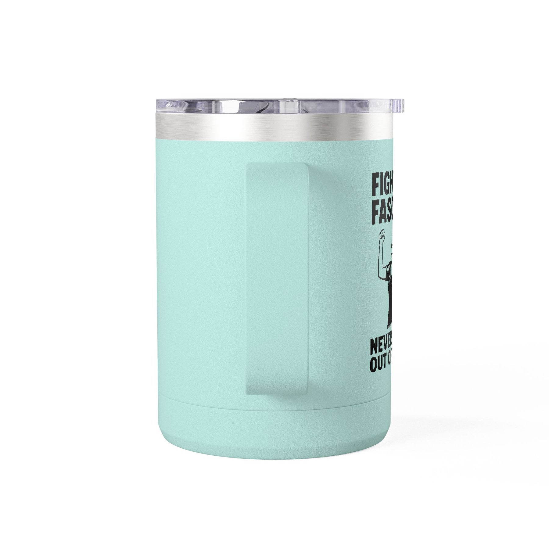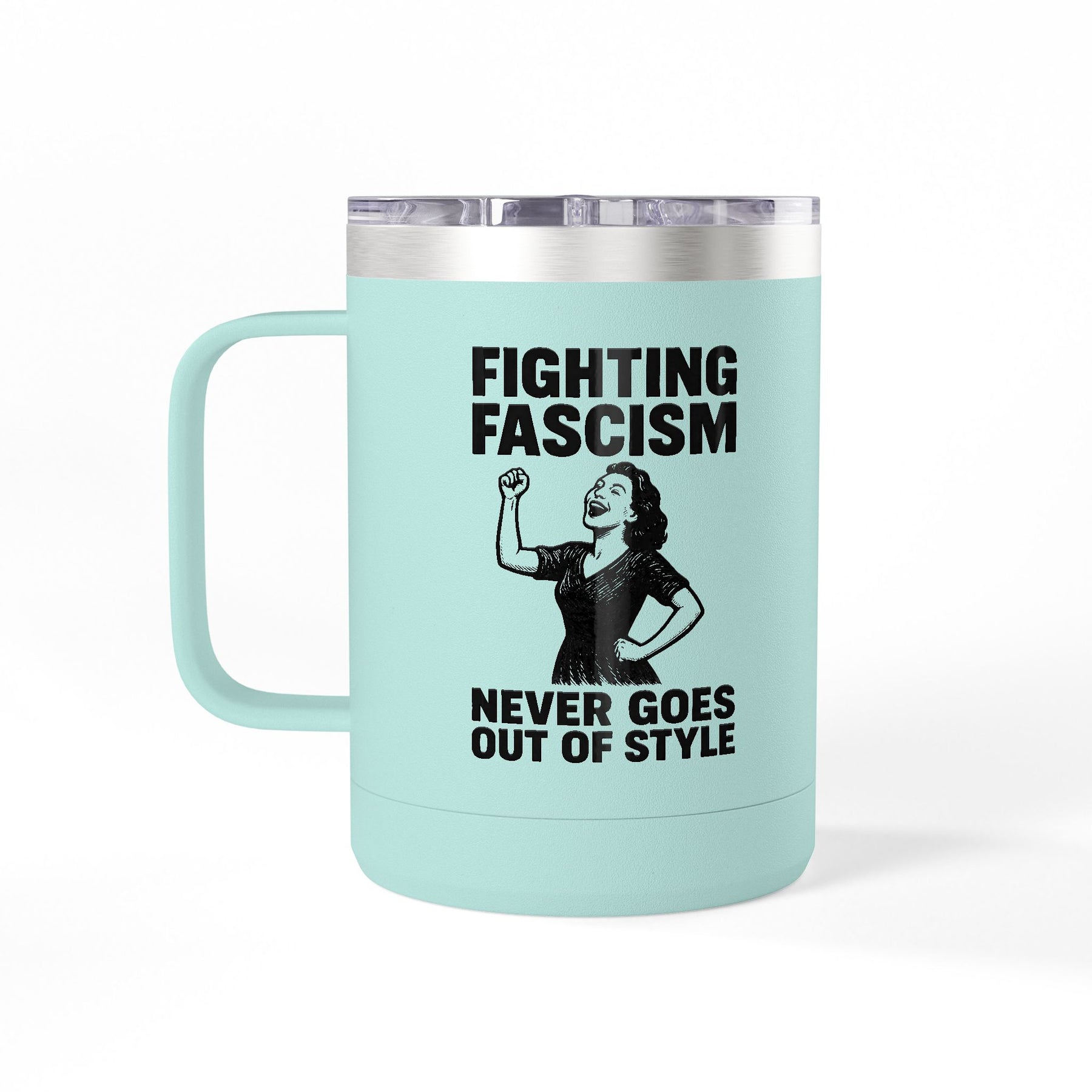 Fighting fascism never goes out of style. A 1940s woman with her fist raised travels with your morning coffee, reminding you that anti-fascism isn't a trend—it's timeless. When authoritarianism tries to rebrand itself for new generations, this handled travel mug carries the constant response: raise your fist, hold the line, refuse to normalize tyranny. Double-wall insulation keeps your coffee hot through commutes, organizing meetings, or anywhere you're channeling wartime clarity into daily resistance.