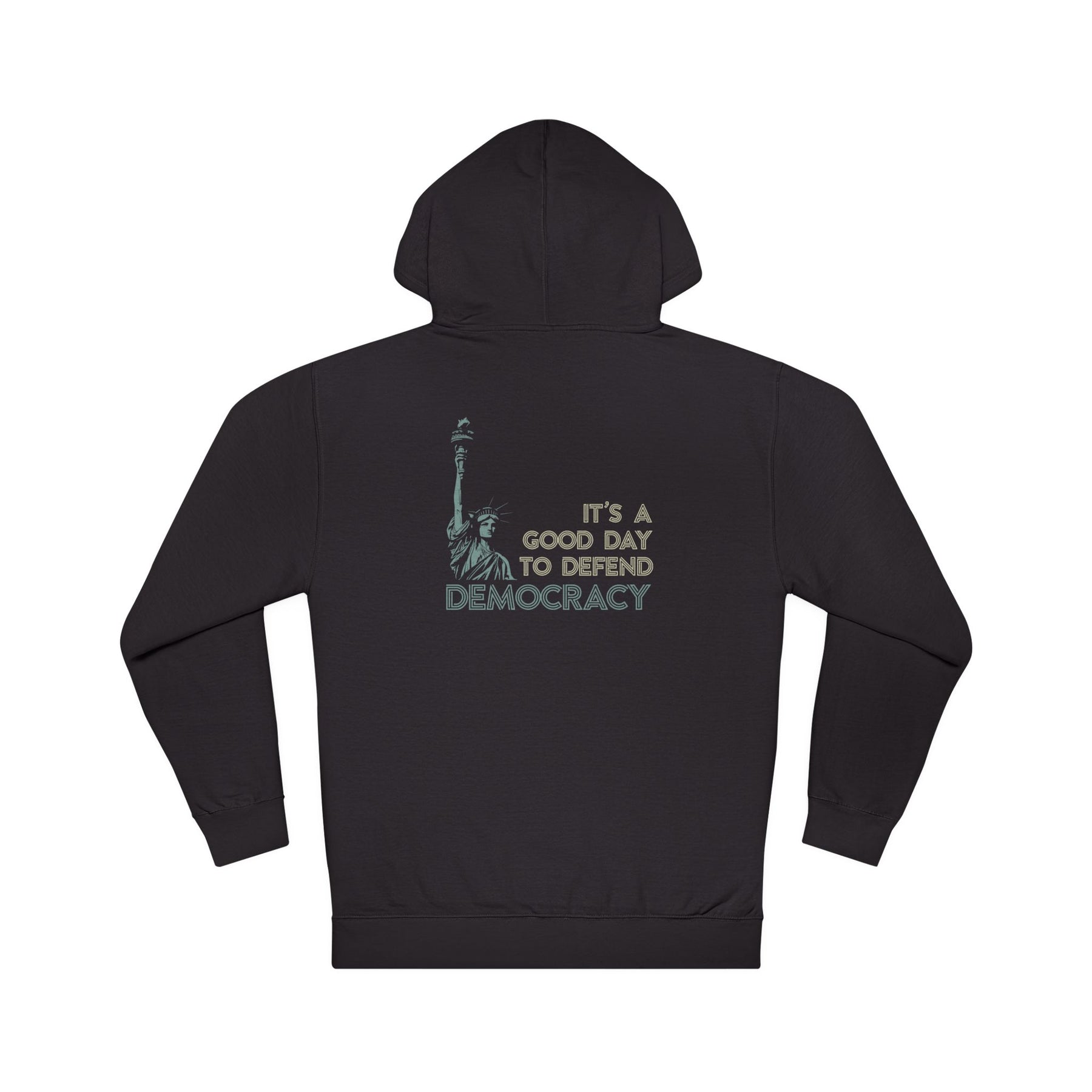 It's a good day to defend democracy. Every day is. Lady Liberty paired with a message for the long haul—showing up, speaking out, and refusing to let cynicism win. Because democracy doesn't defend itself on convenient days or when you're feeling inspired. It requires the mundane work: Tuesday night city council meetings, phone banks when your feet hurt, and conversations that test your patience. Built from soft cotton-poly fleece with a lined hood, this pullover hoodie brings warmth to organizing sessions, voter drives, and every ordinary moment that becomes extraordinary when you choose to show up.