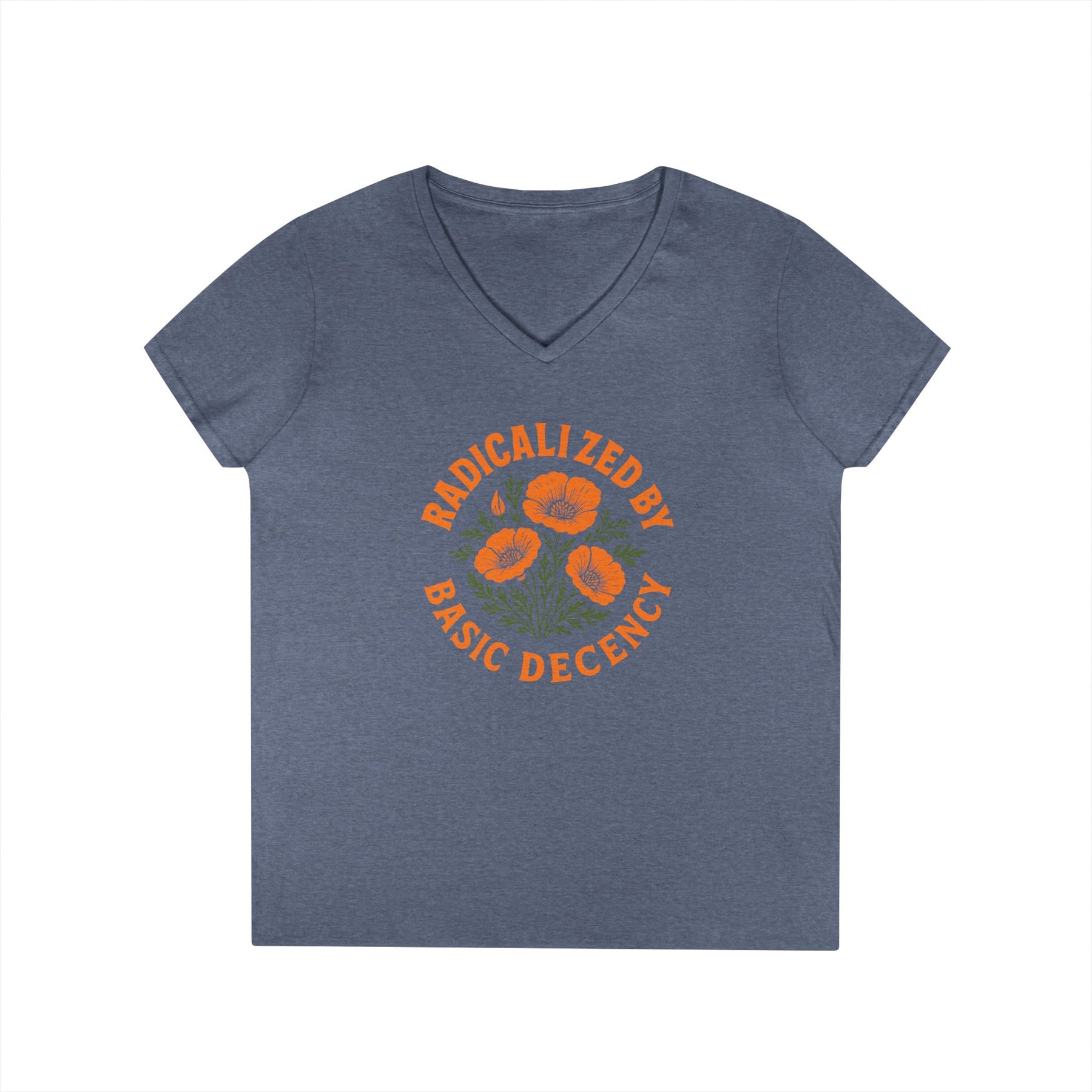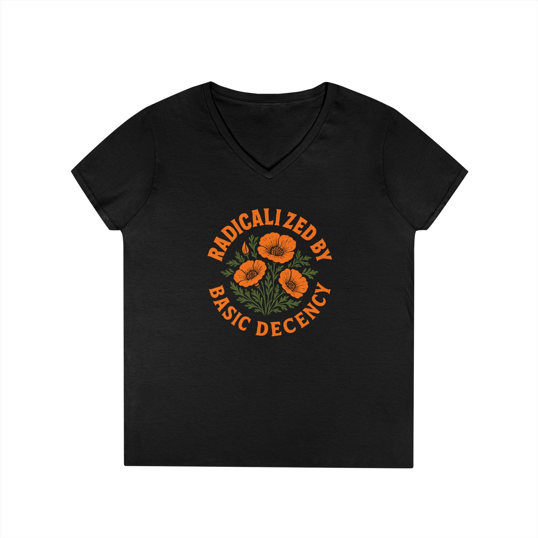 Radicalized by basic decency. When treating people like humans became controversial, when compassion got labeled extremism, when democracy itself needed defending—that's when decency became radical. This design turns the accusation into a badge of honor. Perfect for rallies, protests, or everyday resistance. A semi-fitted women's v-neck made from 100% cotton medium fabric for comfort and breathability.