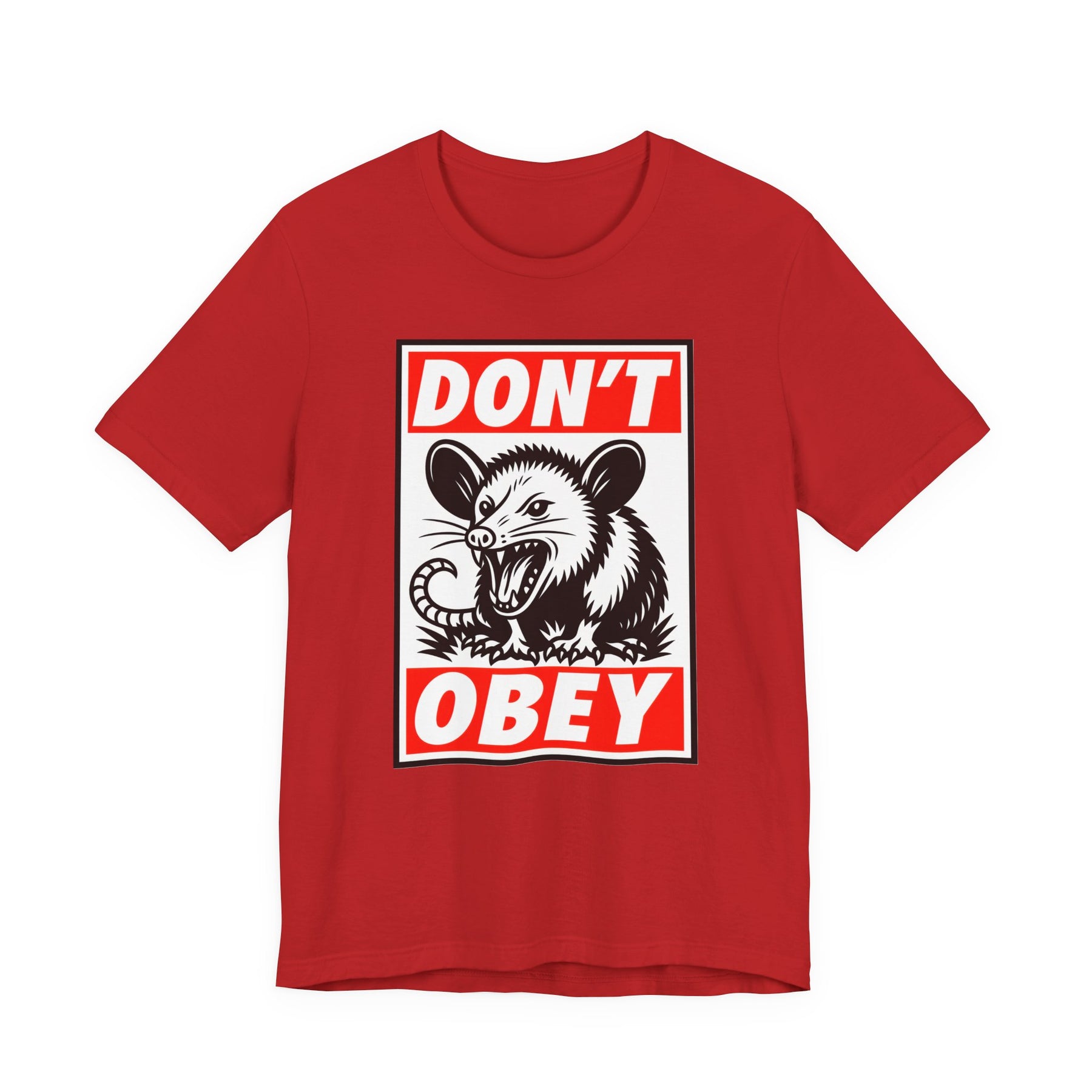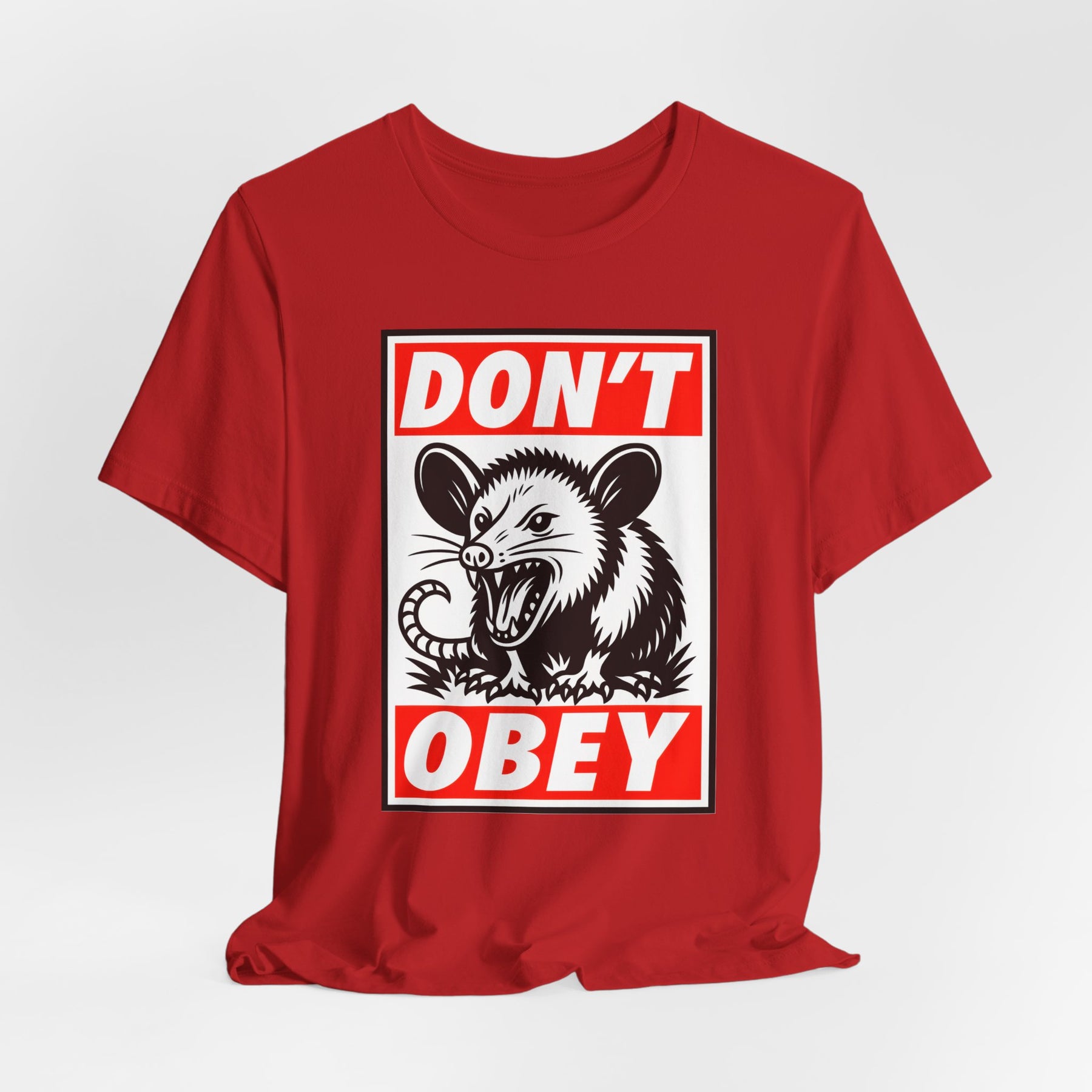 Don't Obey. Nature's scrappiest survivor hissing at authority in bold propaganda poster style. This opossum isn't asking permission or playing nice—it's declaring that obedience to authoritarianism deserves exactly this level of contempt. The Shepard Fairey-inspired design flips iconic street art aesthetics into resistance messaging with red and black boldness. Made from soft, breathable Bella+Canvas cotton that works at rallies, organizing meetings, or anywhere blind obedience needs challenging.