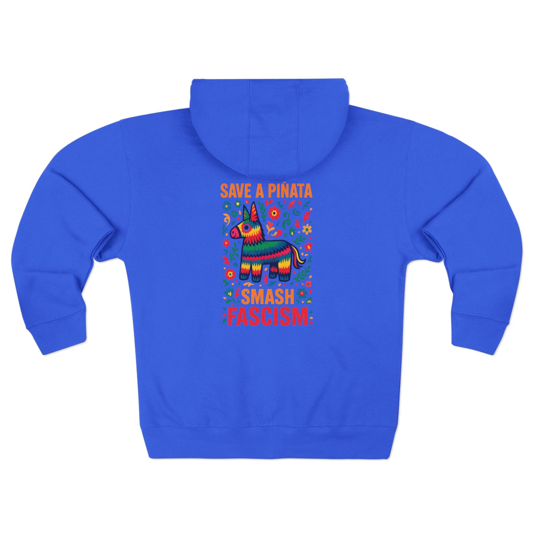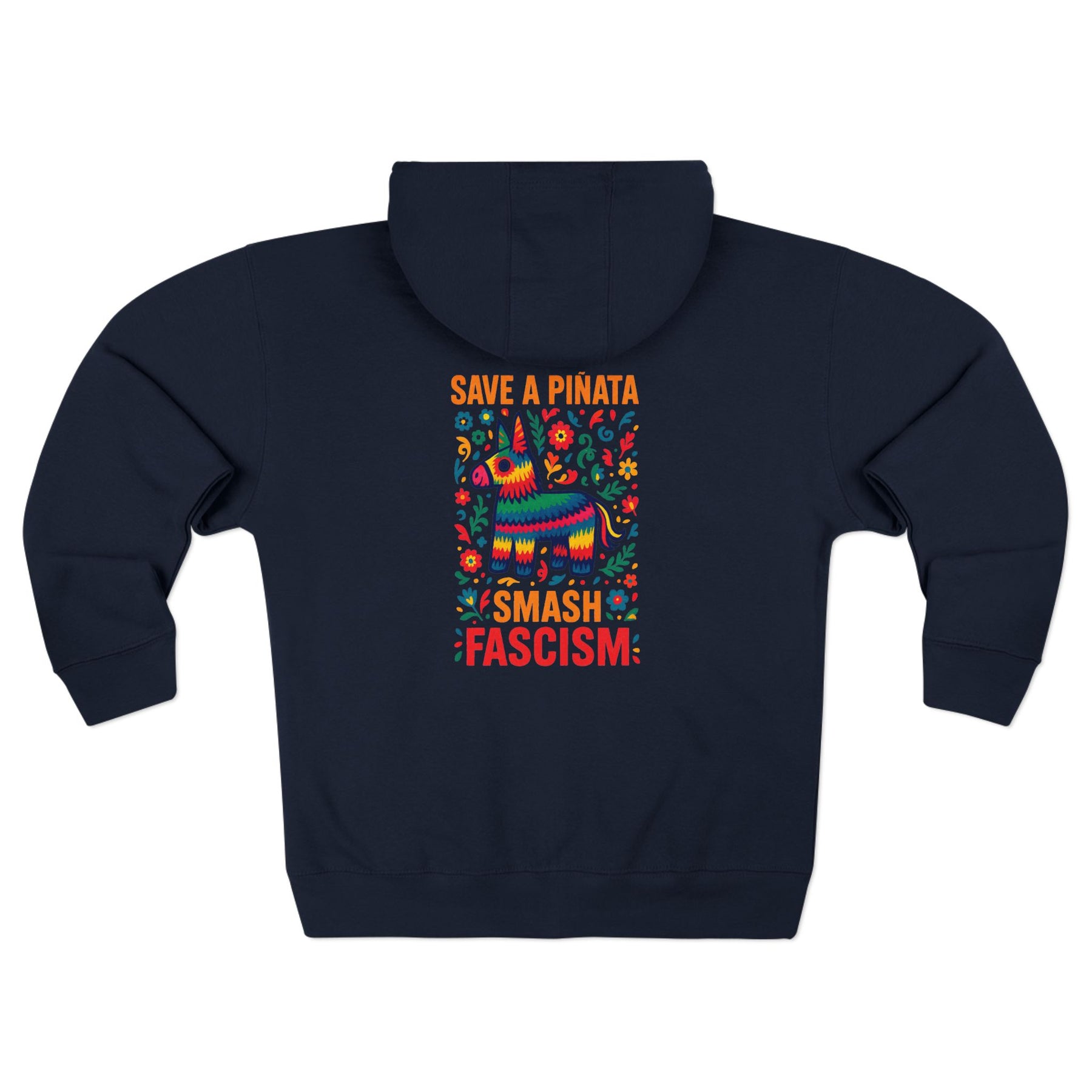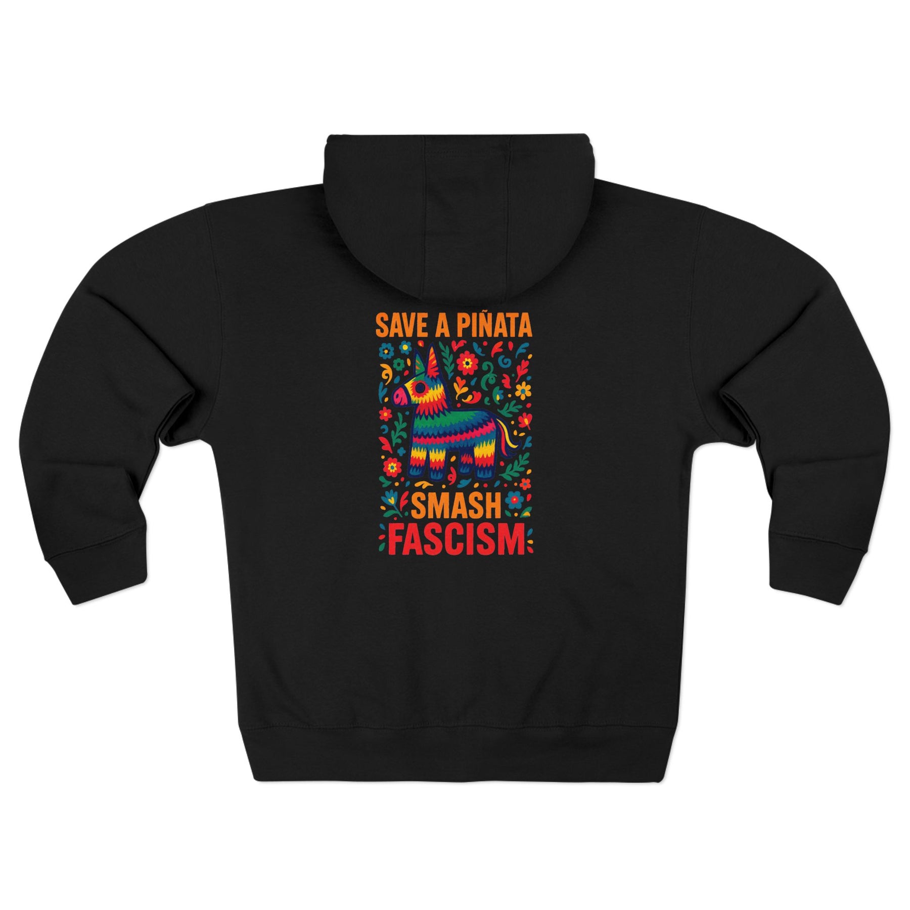 SAVE A PIÑATA, SMASH FASCISM. Folk art wisdom printed on fleece—keep the candy celebration, aim the bat at authoritarianism instead. This vibrant Mexican folk art design delivers the most practical lesson in resistance: some things deserve protection, others deserve dismantling, and knowing the difference is half the work. Built from soft cotton-poly fleece with a full-zip front for cold-weather protests, organizing meetings, or anywhere festive rage meets strategic action.